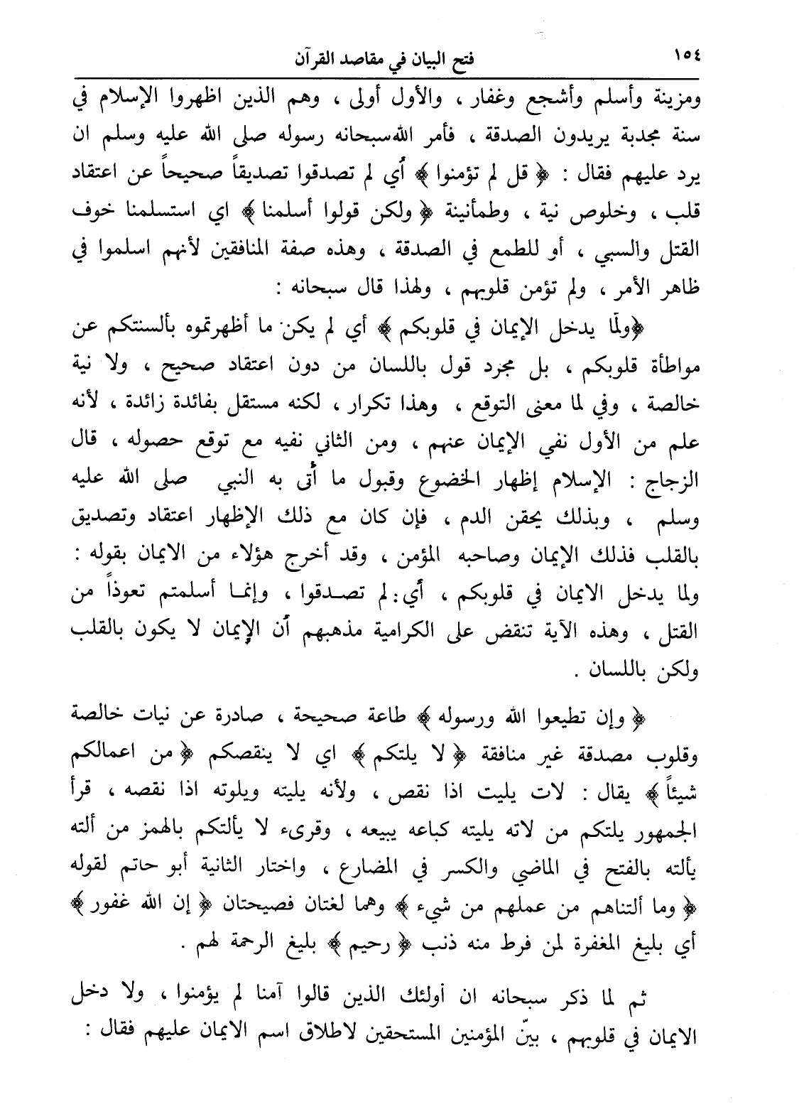 (ولما يدخل الإيمان في قلوبكم) أي لم يكن ما أظهرتموه بألسنتكم عن مواطأة قلوبكم، بل مجرد قول باللسان من دون اعتقاد صحيح، ولا نية خالصة، وفي لما معنى التوقع، وهذا تكرار، لكنه مستقل بفائدة زائدة، لأنه علم من الأول نفي الإيمان عنهم، ومن الثاني نفيه مع توقع حصوله، قال الزجاج: الإسلام إظهار الخضوع وقبول ما أتى به النبي صلى الله عليه وسلم، وبذلك يحقن الدم، فإن كان مع ذلك الإظهار اعتقاد وتصديق بالقلب فذلك الإيمان وصاحبه المؤمن، وقد أخرج هؤلاء من الإيمان بقوله: ولما يدخل الإيمان في قلوبكم، أي: لم تصدقوا، وإنما أسلمتم تعوذاً من القتل، وهذه الآية تنقض على الكرامية مذهبهم أن الإيمان لا يكون بالقلب ولكن باللسان.