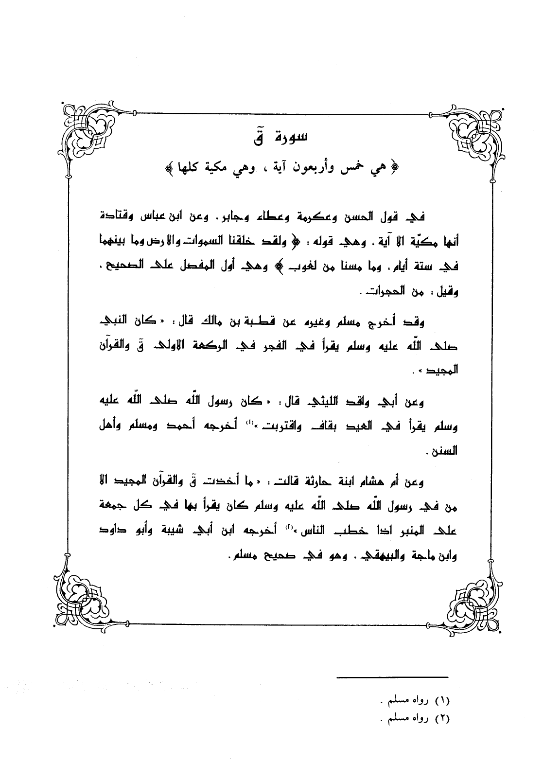 وعن أم هشام ابنة حارثة قالت: " ما أخذت (ق وَالْقُرْآنِ الْمَجِيدِ) إلا من في رسول الله - صلى الله عليه وسلم - كان يقرأ بها في كل جمعة على المنبر إذا خطب الناس " (¬2) أخرجه ابن أبي شيبة وأبو داود وابن ماجة والبيهقي، وهو في صحيح مسلم.