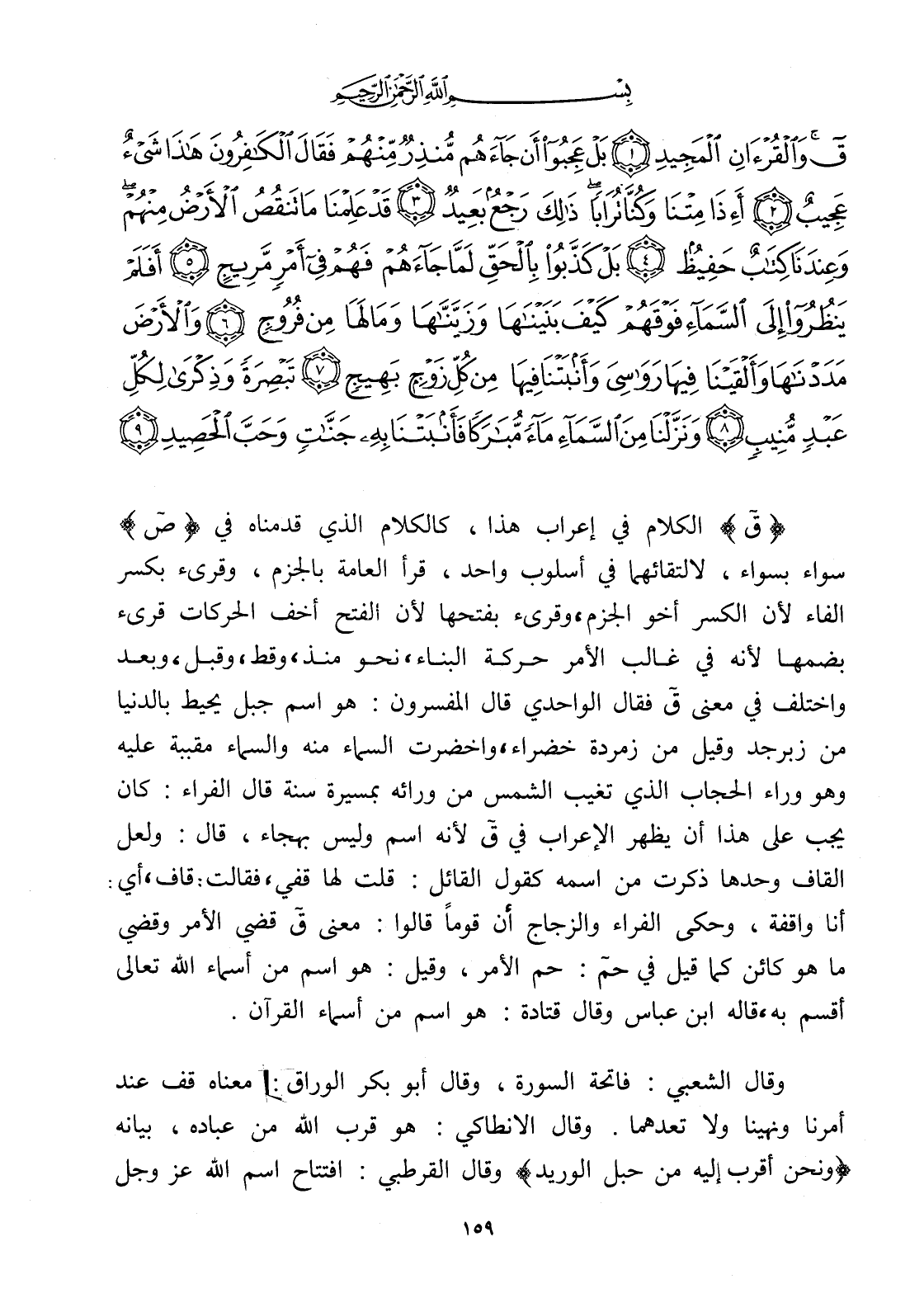 ق وَالْقُرْآنِ الْمَجِيدِ (1) بَلْ عَجِبُوا أَنْ جَاءَهُمْ مُنْذِرٌ مِنْهُمْ فَقَالَ الْكَافِرُونَ هَذَا شَيْءٌ عَجِيبٌ (2) أَإِذَا مِتْنَا وَكُنَّا تُرَابًا ذَلِكَ رَجْعٌ بَعِيدٌ (3) قَدْ عَلِمْنَا مَا تَنْقُصُ الْأَرْضُ مِنْهُمْ وَعِنْدَنَا كِتَابٌ حَفِيظٌ (4) بَلْ كَذَّبُوا بِالْحَقِّ لَمَّا جَاءَهُمْ فَهُمْ فِي أَمْرٍ مَرِيجٍ (5) أَفَلَمْ يَنْظُرُوا إِلَى السَّمَاءِ فَوْقَهُمْ كَيْفَ بَنَيْنَاهَا وَزَيَّنَّاهَا وَمَا لَهَا مِنْ فُرُوجٍ (6) وَالْأَرْضَ مَدَدْنَاهَا وَأَلْقَيْنَا فِيهَا رَوَاسِيَ وَأَنْبَتْنَا فِيهَا مِنْ كُلِّ زَوْجٍ بَهِيجٍ (7) تَبْصِرَةً وَذِكْرَى لِكُلِّ عَبْدٍ مُنِيبٍ (8) وَنَزَّلْنَا مِنَ السَّمَاءِ مَاءً مُبَارَكًا فَأَنْبَتْنَا بِهِ جَنَّاتٍ وَحَبَّ الْحَصِيدِ (9)