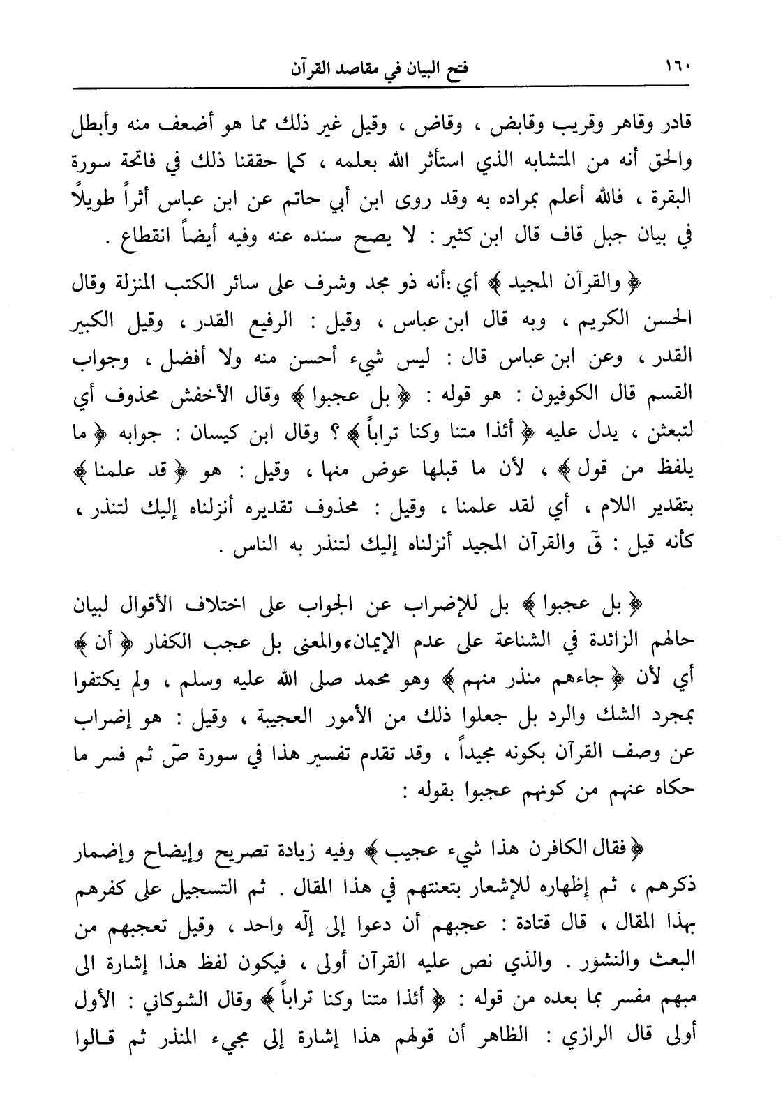 (بل عجبوا) وقال الأخفش محذوف أي لتبعثن، يدل عليه (أئذا متنا وكنا تراباً)؟ وقال ابن كيسان: جوابه (ما يلفظ من قول)، لأن ما قبلها عوض منها، وقيل: هو (قد علمنا) بتقدير اللام، أي لقد علمنا، وقيل: محذوف تقديره أنزلناه إليك لتنذر، كأنه قيل: ق والقرآن المجيد أنزلناه إليك لتنذر به الناس.