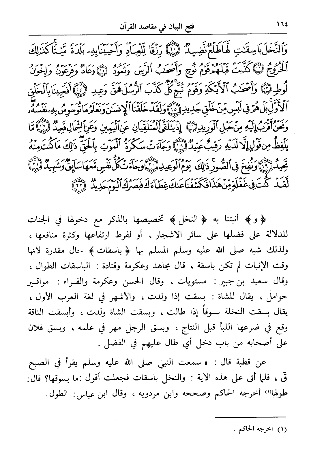 وَالنَّخْلَ بَاسِقَاتٍ لَهَا طَلْعٌ نَضِيدٌ (10) رِزْقًا لِلْعِبَادِ وَأَحْيَيْنَا بِهِ بَلْدَةً مَيْتًا كَذَلِكَ الْخُرُوجُ (11) كَذَّبَتْ قَبْلَهُمْ قَوْمُ نُوحٍ وَأَصْحَابُ الرَّسِّ وَثَمُودُ (12) وَعَادٌ وَفِرْعَوْنُ وَإِخْوَانُ لُوطٍ (13) وَأَصْحَابُ الْأَيْكَةِ وَقَوْمُ تُبَّعٍ كُلٌّ كَذَّبَ الرُّسُلَ فَحَقَّ وَعِيدِ (14) أَفَعَيِينَا بِالْخَلْقِ الْأَوَّلِ بَلْ هُمْ فِي لَبْسٍ مِنْ خَلْقٍ جَدِيدٍ (15) وَلَقَدْ خَلَقْنَا الْإِنْسَانَ وَنَعْلَمُ مَا تُوَسْوِسُ بِهِ نَفْسُهُ وَنَحْنُ أَقْرَبُ إِلَيْهِ مِنْ حَبْلِ الْوَرِيدِ (16) إِذْ يَتَلَقَّى الْمُتَلَقِّيَانِ عَنِ الْيَمِينِ وَعَنِ الشِّمَالِ قَعِيدٌ (17) مَا يَلْفِظُ مِنْ قَوْلٍ إِلَّا لَدَيْهِ رَقِيبٌ عَتِيدٌ (18) وَجَاءَتْ سَكْرَةُ الْمَوْتِ بِالْحَقِّ ذَلِكَ مَا كُنْتَ مِنْهُ تَحِيدُ (19) وَنُفِخَ فِي الصُّورِ ذَلِكَ يَوْمُ الْوَعِيدِ (20) وَجَاءَتْ كُلُّ نَفْسٍ مَعَهَا سَائِقٌ وَشَهِيدٌ (21) لَقَدْ كُنْتَ فِي غَفْلَةٍ مِنْ هَذَا فَكَشَفْنَا عَنْكَ غِطَاءَكَ فَبَصَرُكَ الْيَوْمَ حَدِيدٌ (22)