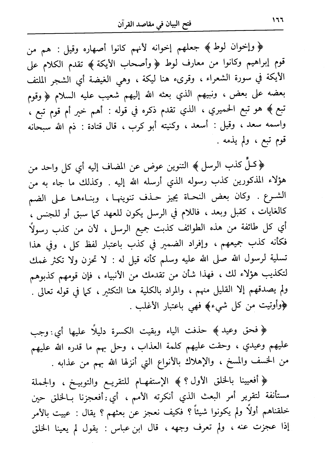 (فحق وعيد) حذفت الياء وبقيت الكسرة دليلاً عليها أي: وجب عليهم وعيدي، وحقت عليهم كلمة العذاب، وحل بهم ما قدره الله عليهم من الخسف والمسخ، والإهلاك بالأنواع التي أنزلها الله بهم من عذابه.