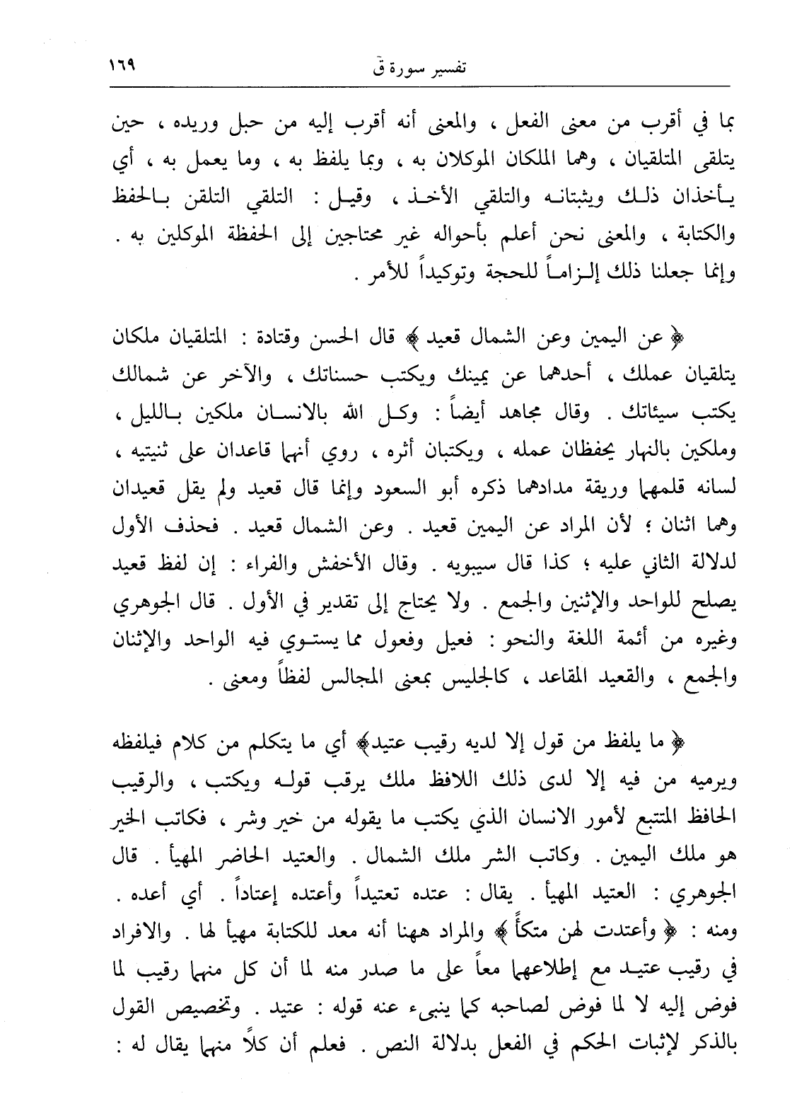 (عن اليمين وعن الشمال قعيد) قال الحسن وقتادة: المتلقيان ملكان يتلقيان عملك، أحدهما عن يمينك ويكتب حسناتك، والآخر عن شمالك يكتب سيئاتك. وقال مجاهد أيضاًً: وكل الله بالإنسان ملكين بالليل، وملكين بالنهار يحفظان عمله، ويكتبان أثره، روي أنهما قاعدان على ثنيتيه، لسانه قلمهما وريقه مدادهما ذكره أبو السعود وإنما قال قعيد ولم يقل قعيدان وهما اثنان؛ لأن المراد عن اليمين قعيد. وعن الشمال قعيد. فحذف الأول لدلالة الثاني عليه؛ كذا قال سيبويه. وقال الأخفش والفراء: إن لفظ قعيد يصلح للواحد والإثنين والجمع. ولا يحتاج إلى تقدير في الأول. قال الجوهري وغيره من أئمة اللغة والنحو: فعيل وفعول مما يستوي فيه الواحد والإثنان والجمع، والقعيد المقاعد، كالجليس بمعنى المجالس لفظاً ومعنى.