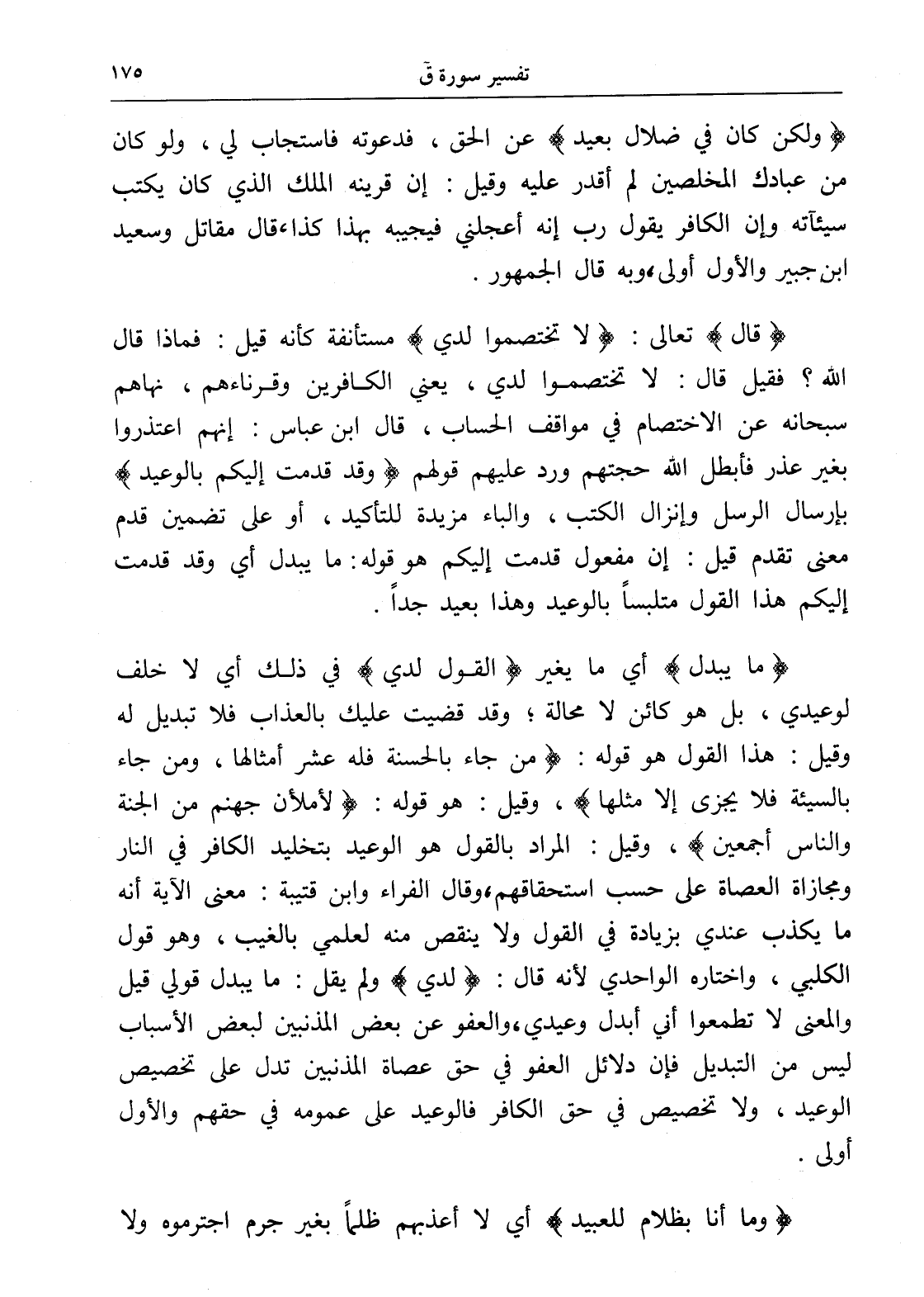 (ما يبدل) أي ما يغير (القول لدي) في ذلك أي لا خلف لوعيدي، بل هو كائن لا محالة؛ وقد قضيت عليك بالعذاب فلا تبديل له وقيل: هذا القول هو قوله: (مَنْ جَاءَ بِالْحَسَنَةِ فَلَهُ عَشْرُ أَمْثَالِهَا وَمَنْ جَاءَ بِالسَّيِّئَةِ فَلَا يُجْزَى إِلَّا مِثْلَهَا)، وقيل: هو قوله: (لأملأن جهنم من الجنة والناس أجمعين)، وقيل: المراد بالقول هو الوعيد بتخليد الكافر في النار ومجازاة العصاة على حسب استحقاقهم، وقال الفراء وابن قتيبة: معنى الآية أنه ما يكذب عندي بزيادة في القول ولا ينقص منه لعلمي بالغيب، وهو قول الكلبي، واختاره الواحدي لأنه قال: (لدي) ولم يقل: ما يبدل قولي قيل والمعنى لا تطمعوا أني أبدل وعيدي، والعفو عن بعض المذنبين لبعض الأسباب ليس من التبديل فإن دلائل العفو في حق عصاة المذنبين تدل على تخصيص الوعيد، ولا تخصيص في حق الكافر فالوعيد على عمومه في حقهم والأول أولى.