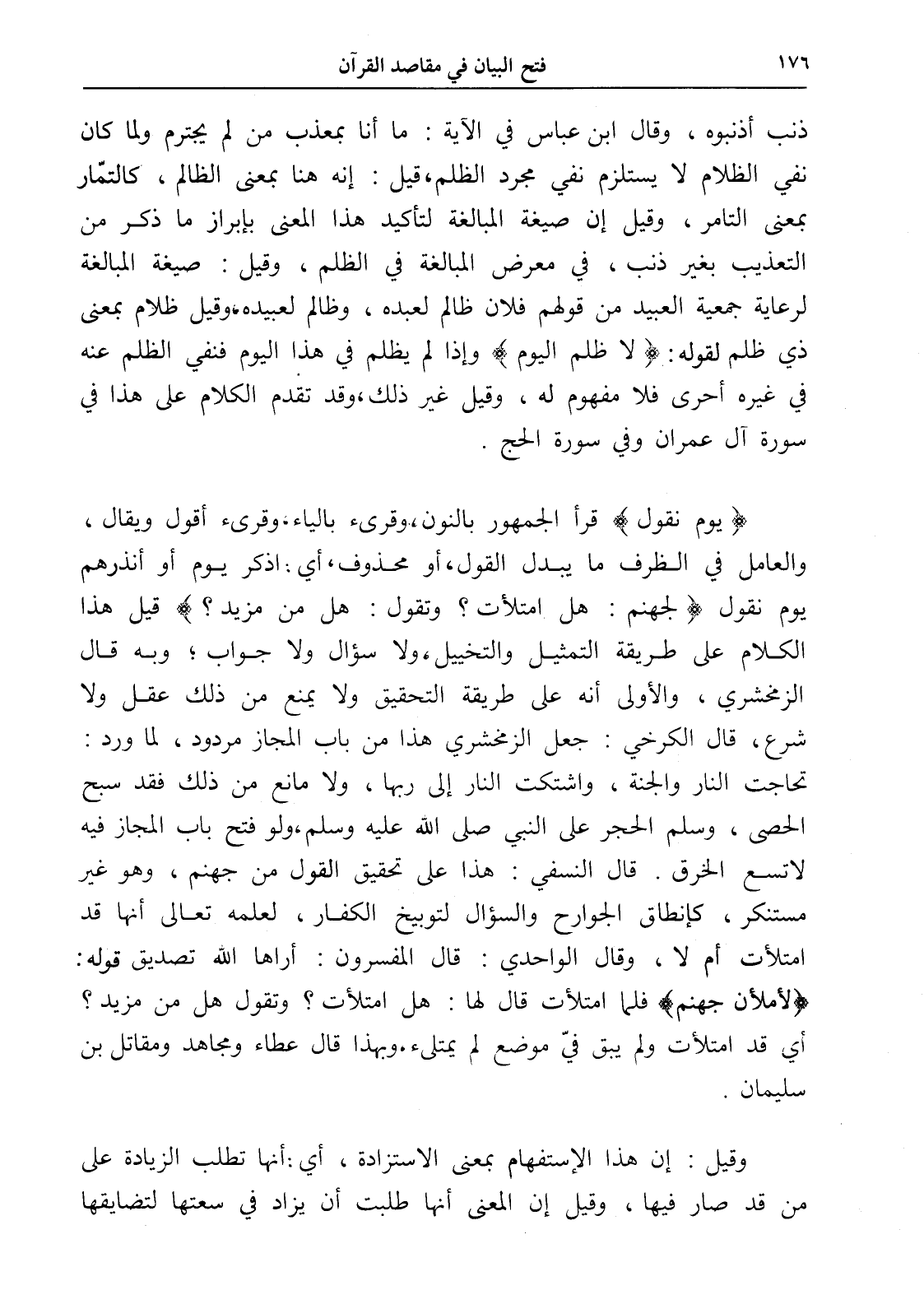 (يَوْمَ نَقُولُ) قرأ الجمهور بالنون، وقرىء بالياء، وقرىء أقول ويقال، والعامل في الظرف ما يبدل القول، أو محذوف، أي: اذكر يوم أو أنذرهم يوم نقول (لِجَهَنَّمَ هَلِ امْتَلَأْتِ وَتَقُولُ هَلْ مِنْ مَزِيدٍ)؟ قيل هذا الكلام على طريقة التمثيل والتخييل، ولا سؤال ولا جواب؛ وبه قال الزمخشري، والأولى أنه على طريقة التحقيق ولا يمنع من ذلك عقل ولا شرع، قال الكرخي: جعل الزمخشري هذا من باب المجاز مردود، لما ورد: تحاجت النار والجنة، واشتكت النار إلى ربها، ولا مانع من ذلك فقد سبح الحصى، وسلم الحجر على النبي صلى الله عليه وسلم، ولو فتح باب المجاز فيه لاتسع الخرق. قال النسفي: هذا على تحقيق القول من جهنم، وهو غير مستنكر، كإنطاق الجوارح والسؤال لتوبيخ الكفار، لعلمه تعالى أنها قد امتلأت أم لا، وقال الواحدي: قال المفسرون: أراها الله تصديق قوله: (لأملأن جهنم) فلما امتلأت قال لها: هل امتلأت؟ وتقول هل من مزيد؟ أي قد امتلأت ولم يبق فيّ موضع لم يمتلىء. وبهذا قال عطاء ومجاهد ومقاتل بن سليمان.