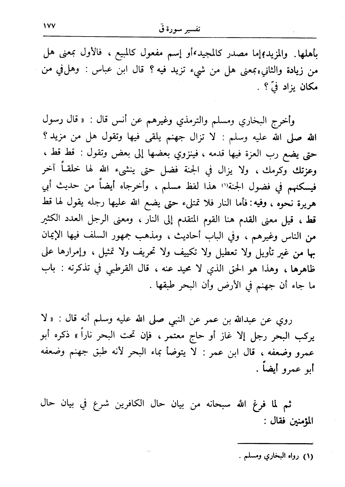 وأخرج البخاري ومسلم والترمذي وغيرهم عن أنس قال: " قال رسول الله صلى الله عليه وسلم: لا تزال جهنم يلقى فيها وتقول هل من مزيد؟ حتى يضع رب العزة فيها قدمه، فينزوي بعضها إلى بعض وتقول: قط قط، وعزتك وكرمك، ولا يزال في الجنة فضل حتى ينشىء الله لها خلقاً آخر فيسكنهم في فضول الجنة (¬1) هذا لفظ مسلم، وأخرجاه أيضاًً من حديث أبي هريرة نحوه، وفيه: فأما النار فلا تمتلىء حتى يضع الله عليها رجله يقول لها قط قط، قيل معنى القدم هنا القوم المتقدم إلى النار، ومعنى الرجل العدد الكثير من الناس وغيرهم، وفي الباب أحاديث، ومذهب جمهور السلف فيها الإيمان بها من غير تأويل ولا تعطيل ولا تكييف ولا تحريف ولا تمثيل، وإمرارها على ظاهرها، وهذا هو الحق الذي لا محيد عنه، قال القرطبي في تذكرته: باب ما جاء أن جهنم في الأرض وأن البحر طبقها.