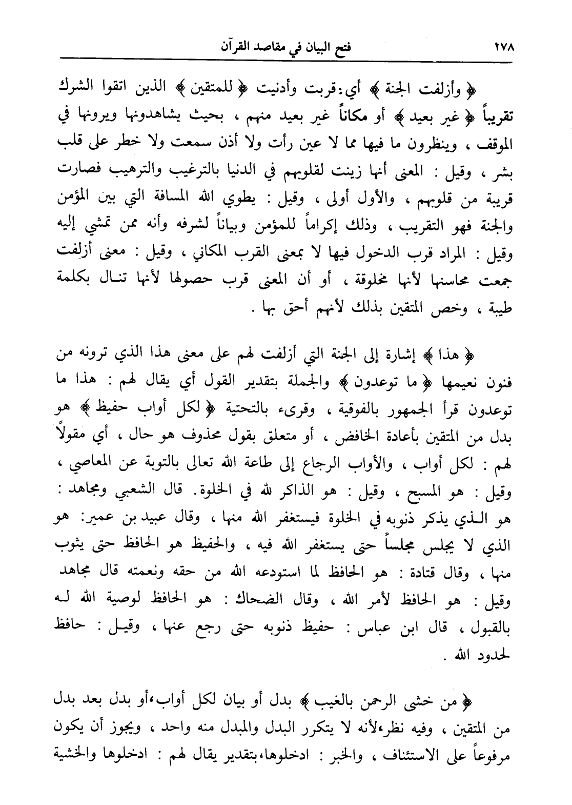 (وأزلفت الجنة) أي: قربت وأدنيت (للمتقين) الذين اتقوا الشرك تقريباً (غير بعيد) أو مكاناً غير بعيد منهم، بحيث يشاهدونها ويرونها في الموقف، وينظرون ما فيها مما لا عين رأت ولا أذن سمعت ولا خطر على قلب بشر، وقيل: المعنى أنها زينت لقلوبهم في الدنيا بالترغيب والترهيب فصارت قريبة من قلوبهم، والأول أولى، وقيل: يطوي الله المسافة التي بين المؤمن والجنة فهو التقريب، وذلك إكراماً للمؤمن وبياناً لشرفه وأنه ممن تمشي إليه وقيل: المراد قرب الدخول فيها لا بمعنى القرب المكاني، وقيل: معنى أزلفت جمعت محاسنها لأنها مخلوقة، أو أن المعنى قرب حصولها لأنها تنال بكلمة طيبة، وخص المتقين بذلك لأنهم أحق بها.