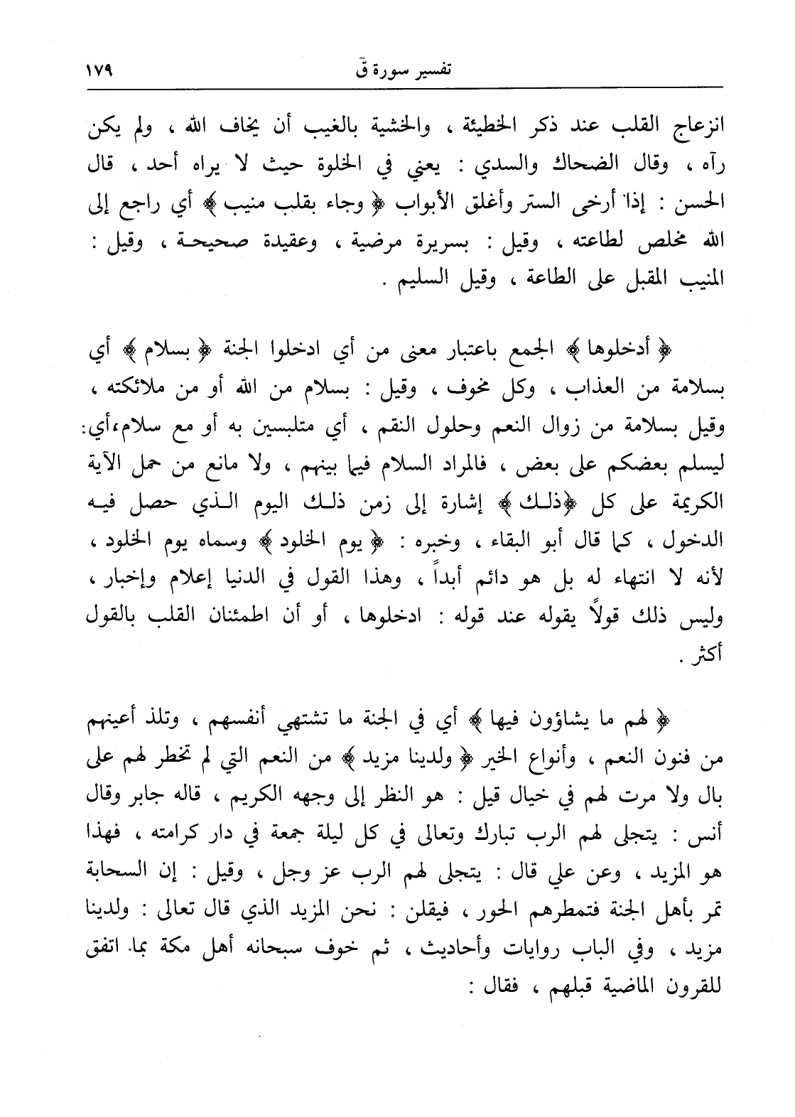 (لهم ما يشاؤون فيها) أي في الجنة ما تشتهي أنفسهم، وتلذ أعينهم من فنون النعم، وأنواع الخير (ولدينا مزيد) من النعم التي لم تخطر لهم على بال ولا مرت لهم في خيال قيل: هو النظر إلى وجهه الكريم، قاله جابر وقال أنس: يتجلى لهم الرب تبارك وتعالى في كل ليلة جمعة في دار كرامته، فهذا هو المزيد، وعن علي قال: يتجلى لهم الرب عز وجل، وقيل: إن السحابة تمر بأهل الجنة فتمطرهم الحور، فيقلن: نحن المزيد الذي قال تعالى: ولدينا مزيد، وفي الباب روايات وأحاديث، ثم خوف سبحانه أهل مكة بما اتفق للقرون الماضية قبلهم، فقال: