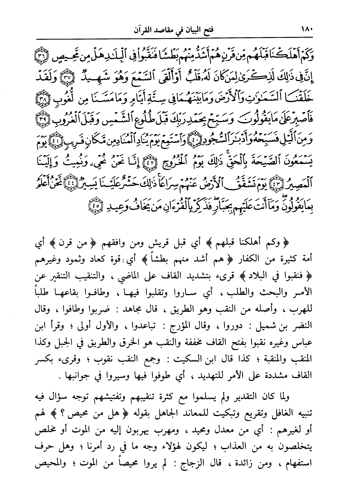 وَكَمْ أَهْلَكْنَا قَبْلَهُمْ مِنْ قَرْنٍ هُمْ أَشَدُّ مِنْهُمْ بَطْشًا فَنَقَّبُوا فِي الْبِلَادِ هَلْ مِنْ مَحِيصٍ (36) إِنَّ فِي ذَلِكَ لَذِكْرَى لِمَنْ كَانَ لَهُ قَلْبٌ أَوْ أَلْقَى السَّمْعَ وَهُوَ شَهِيدٌ (37) وَلَقَدْ خَلَقْنَا السَّمَاوَاتِ وَالْأَرْضَ وَمَا بَيْنَهُمَا فِي سِتَّةِ أَيَّامٍ وَمَا مَسَّنَا مِنْ لُغُوبٍ (38) فَاصْبِرْ عَلَى مَا يَقُولُونَ وَسَبِّحْ بِحَمْدِ رَبِّكَ قَبْلَ طُلُوعِ الشَّمْسِ وَقَبْلَ الْغُرُوبِ (39) وَمِنَ اللَّيْلِ فَسَبِّحْهُ وَأَدْبَارَ السُّجُودِ (40) وَاسْتَمِعْ يَوْمَ يُنَادِ الْمُنَادِ مِنْ مَكَانٍ قَرِيبٍ (41) يَوْمَ يَسْمَعُونَ الصَّيْحَةَ بِالْحَقِّ ذَلِكَ يَوْمُ الْخُرُوجِ (42) إِنَّا نَحْنُ نُحْيِي وَنُمِيتُ وَإِلَيْنَا الْمَصِيرُ (43) يَوْمَ تَشَقَّقُ الْأَرْضُ عَنْهُمْ سِرَاعًا ذَلِكَ حَشْرٌ عَلَيْنَا يَسِيرٌ (44) نَحْنُ أَعْلَمُ بِمَا يَقُولُونَ وَمَا أَنْتَ عَلَيْهِمْ بِجَبَّارٍ فَذَكِّرْ بِالْقُرْآنِ مَنْ يَخَافُ وَعِيدِ (45)