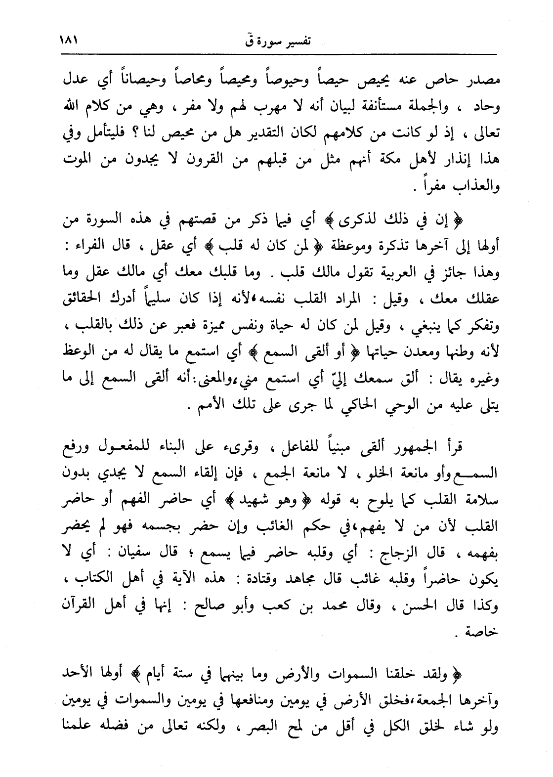 (ولقد خلقنا السموات والأرض وما بينهما في ستة أيام) أولها الأحد وآخرها الجمعة، فخلق الأرض في يومين ومنافعها في يومين والسموات في يومين ولو شاء لخلق الكل في أقل من لمح البصر، ولكنه تعالى من فضله علمنا