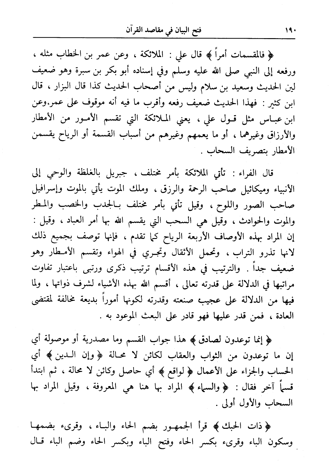 (فالمقسمات أمراً) قال علي: الملائكة، وعن عمر بن الخطاب مثله، ورفعه إلى النبي صلى الله عليه وسلم وفي إسناده أبو بكر بن سبرة وهو ضعيف لين الحديث وسعيد بن سلام وليس من أصحاب الحديث كذا قال البزار، قال ابن كثير: فهذا الحديث ضعيف رفعه وأقرب ما فيه أنه موقوف على عمر، وعن ابن عباس مثل قول علي، يعني الملائكة التي تقسم الأمور من الأمطار والأرزاق وغيرهما، أو ما يعمهم وغيرهم من أسباب القسمة أو الرياح يقسمن الأمطار بتصريف السحاب.