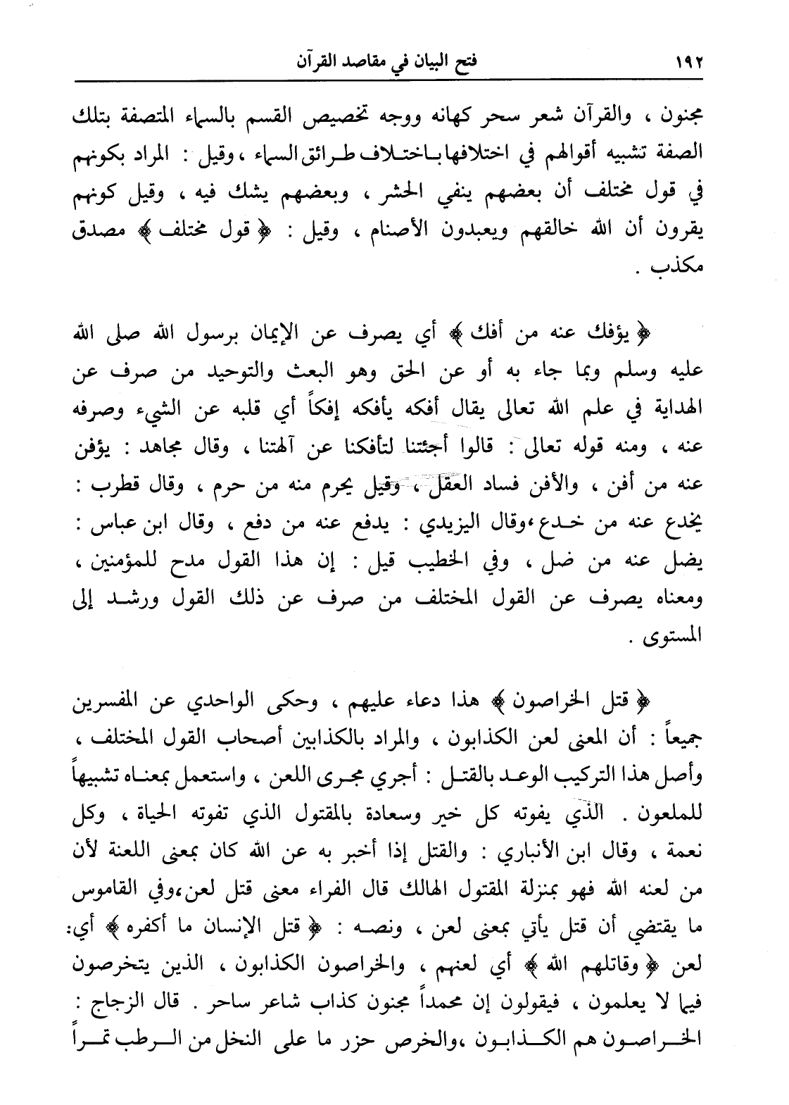 (قتل الخراصون) هذا دعاء عليهم، وحكى الواحدي عن المفسرين جميعاً: أن المعنى لعن الكذابون، والمراد بالكذابين أصحاب القول المختلف، وأصل هذا التركيب الوعد بالقتل: أجري مجرى اللعن، واستعمل بمعناه تشبيهاً للملعون. الذي يفوته كل خير وسعادة بالمقتول الذي تفوته الحياة، وكل نعمة، وقال ابن الأنباري: والقتل إذا أخبر به عن الله كان بمعنى اللعنة لأن من لعنه الله فهو بمنزلة المقتول الهالك قال الفراء معنى قتل لعن، وفي القاموس ما يقتضي أن قتل يأتي بمعنى لعن، ونصه: (قتل الإنسان ما أكفره) أي: لعن (وقاتلهم الله) أي لعنهم، والخراصون الكذابون، الذين يتخرصون فيما لا يعلمون، فيقولون إن محمداً مجنون كذاب شاعر ساحر. قال الزجاج: الخراصون هم الكذابون، والخرص حزر ما على النخل من الرطب تمراً