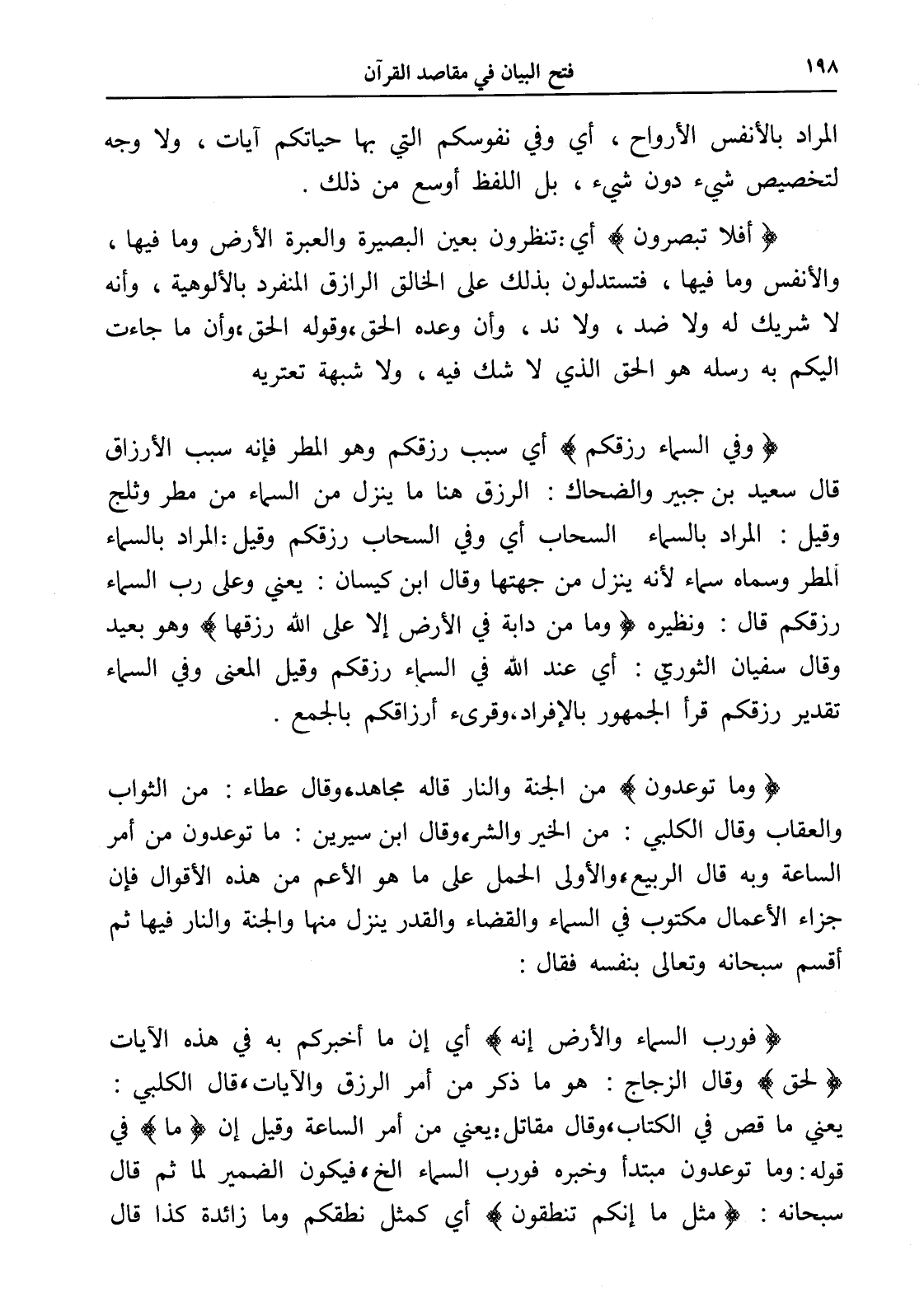 (وفي السماء رزقكم) أي سبب رزقكم وهو المطر فإنه سبب الأرزاق قال سعيد بن جبير والضحاك: الرزق هنا ما ينزل من السماء من مطر وثلج وقيل: المراد بالسماء السحاب أي وفي السحاب رزقكم وقيل: المراد بالسماء المطر وسماه سماء لأنه ينزل من جهتها وقال ابن كيسان: يعني وعلى رب السماء رزقكم قال: ونظيره (وما من دابة في الأرض إلا على الله رزقها) وهو بعيد وقال سفيان الثوري: أي عند الله في السماء رزقكم وقيل المعنى وفي السماء تقدير رزقكم قرأ الجمهور بالإفراد، وقرىء أرزاقكم بالجمع.