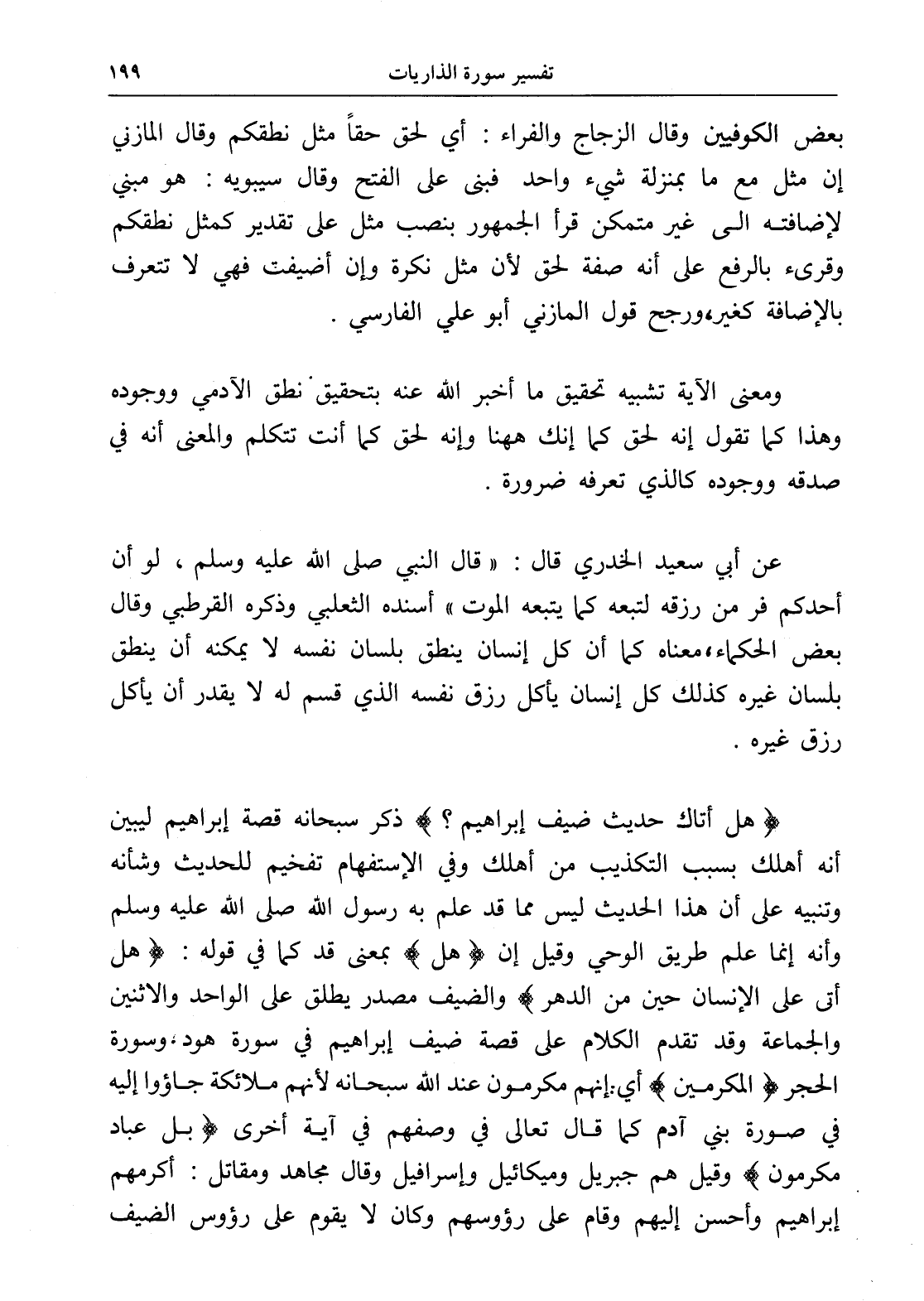 بعض الكوفيين وقال الزجاج والفراء: أي لحق حقاً مثل نطقكم وقال المازني إن مثل مع ما بمنزلة شيء واحد فبنى على الفتح وقال سيبويه: هو مبني لإضافته إلى غير متمكن قرأ الجمهور بنصب مثل على تقدير كمثل نطقكم وقرىء بالرفع على أنه صفة لحق لأن مثل نكرة وإن أضيفت فهي لا تتعرف بالإضافة كغير، ورجح قول المازني أبو علي الفارسي.