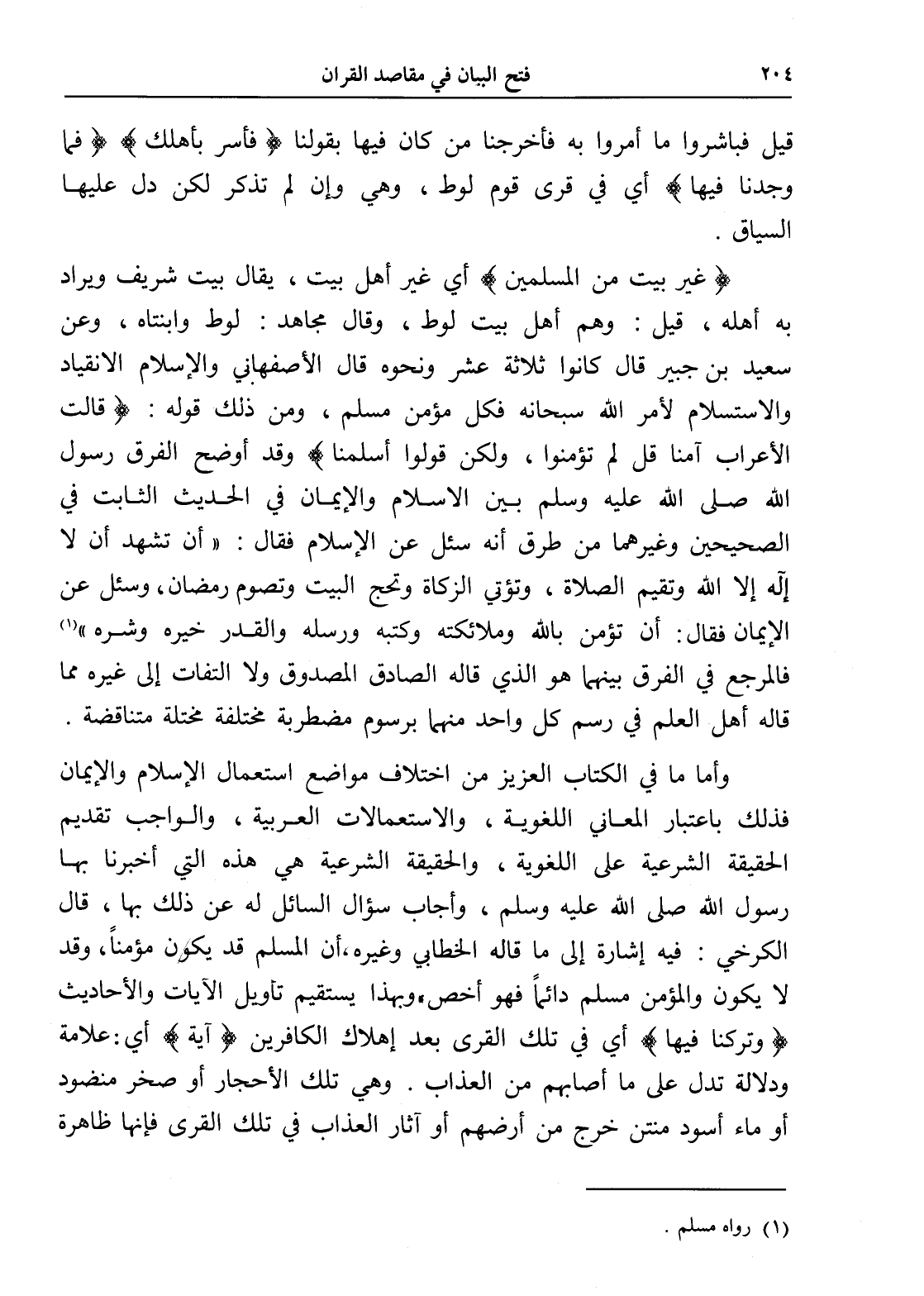 (غير بيت من المسلمين) أي غير أهل بيت، يقال بيت شريف ويراد به أهله، قيل: وهم أهل بيت لوط، وقال مجاهد: لوط وابنتاه، وعن سعيد بن جبير قال كانوا ثلاثة عشر ونحوه قال الأصفهاني والإسلام الإنقياد والاستسلام لأمر الله سبحانه فكل مؤمن مسلم، ومن ذلك قوله: (قَالَتِ الْأَعْرَابُ آمَنَّا قُلْ لَمْ تُؤْمِنُوا وَلَكِنْ قُولُوا أَسْلَمْنَا) وقد أوضح الفرق رسول الله صلى الله عليه وسلم بين الإسلام والإيمان في الحديث الثابت في الصحيحين وغيرهما من طرق أنه سئل عن الإسلام فقال: " أن تشهد أن لا إله إلا الله وتقيم الصلاة، وتؤتي الزكاة وتحج البيت وتصوم رمضان، وسئل عن الإيمان فقال: أن تؤمن بالله وملائكته وكتبه ورسله والقدر خيره وشره " (¬1) فالمرجع في الفرق بينهما هو الذي قاله الصادق المصدوق ولا التفات إلى غيره مما قاله أهل العلم في رسم كل واحد منهما برسوم مضطربة مختلفة مختلة متناقضة.
