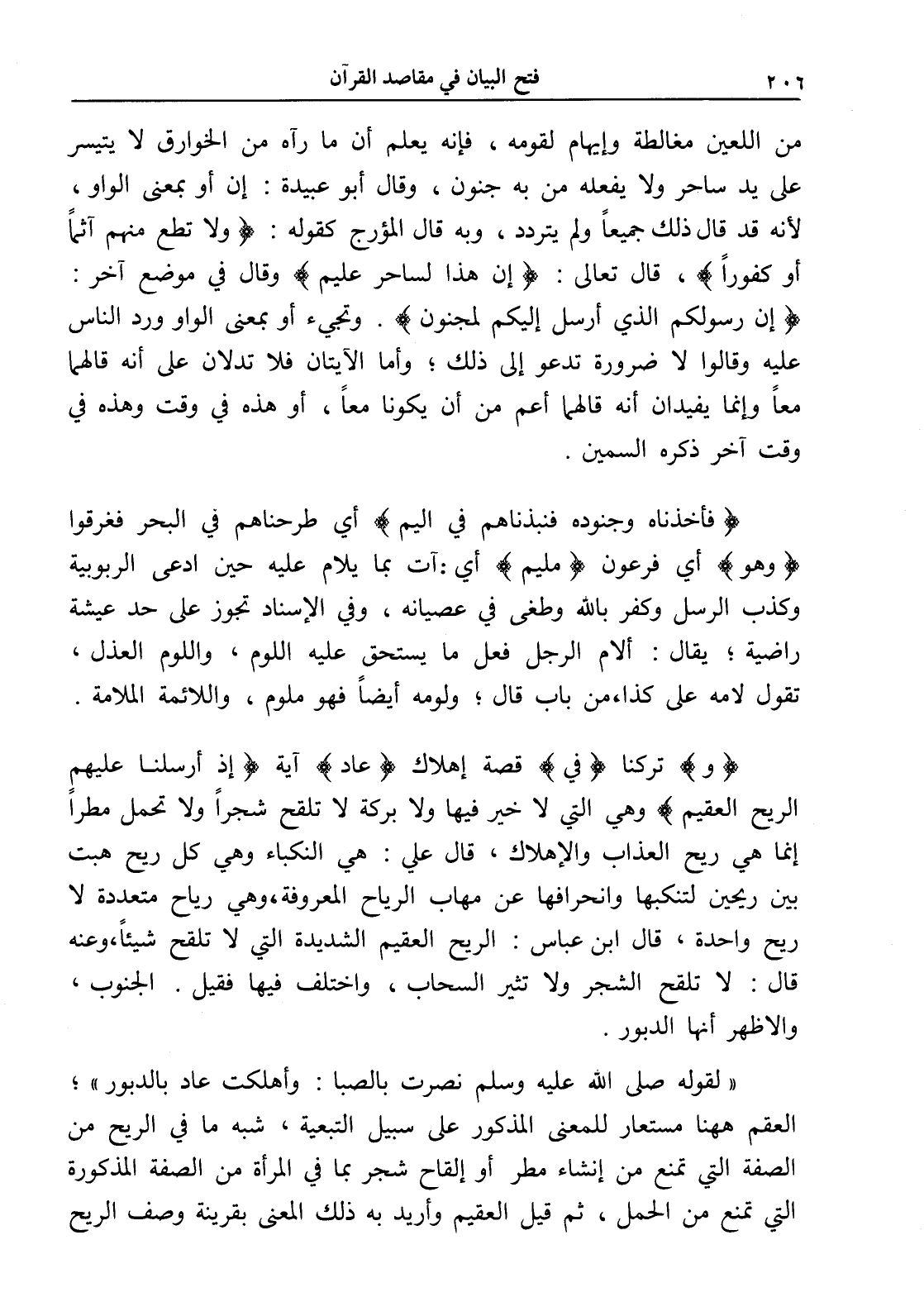 (و) تركنا (في) قصة إهلاك (عاد) آية (إذ أرسلنا عليهم الريح العقيم) وهي التي لا خير فيها ولا بركة لا تلقح شجراً ولا تحمل مطراً إنما هي ريح العذاب والإهلاك، قال علي: هي النكباء وهي كل ريح هبت بين ريحين لتنكبها وانحرافها عن مهاب الرياح المعروفة، وهي رياح متعددة لا ريح واحدة، قال ابن عباس: الريح العقيم الشديدة التي لا تلقح شيئاًً، وعنه قال: لا تلقح الشجر ولا تثير السحاب، واختلف فيها فقيل: الجنوب، والأظهر أنها الدبور.