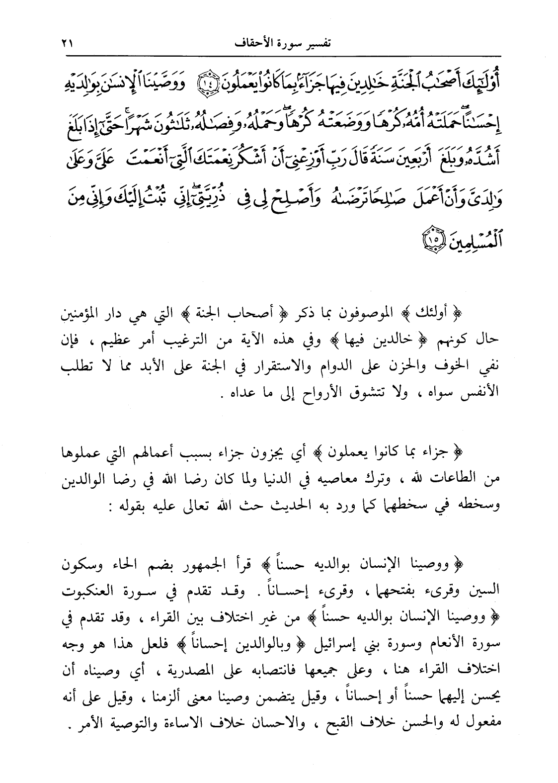 أُولَئِكَ أَصْحَابُ الْجَنَّةِ خَالِدِينَ فِيهَا جَزَاءً بِمَا كَانُوا يَعْمَلُونَ (14) وَوَصَّيْنَا الْإِنْسَانَ بِوَالِدَيْهِ إِحْسَانًا حَمَلَتْهُ أُمُّهُ كُرْهًا وَوَضَعَتْهُ كُرْهًا وَحَمْلُهُ وَفِصَالُهُ ثَلَاثُونَ شَهْرًا حَتَّى إِذَا بَلَغَ أَشُدَّهُ وَبَلَغَ أَرْبَعِينَ سَنَةً قَالَ رَبِّ أَوْزِعْنِي أَنْ أَشْكُرَ نِعْمَتَكَ الَّتِي أَنْعَمْتَ عَلَيَّ وَعَلَى وَالِدَيَّ وَأَنْ أَعْمَلَ صَالِحًا تَرْضَاهُ وَأَصْلِحْ لِي فِي ذُرِّيَّتِي إِنِّي تُبْتُ إِلَيْكَ وَإِنِّي مِنَ الْمُسْلِمِينَ (15)