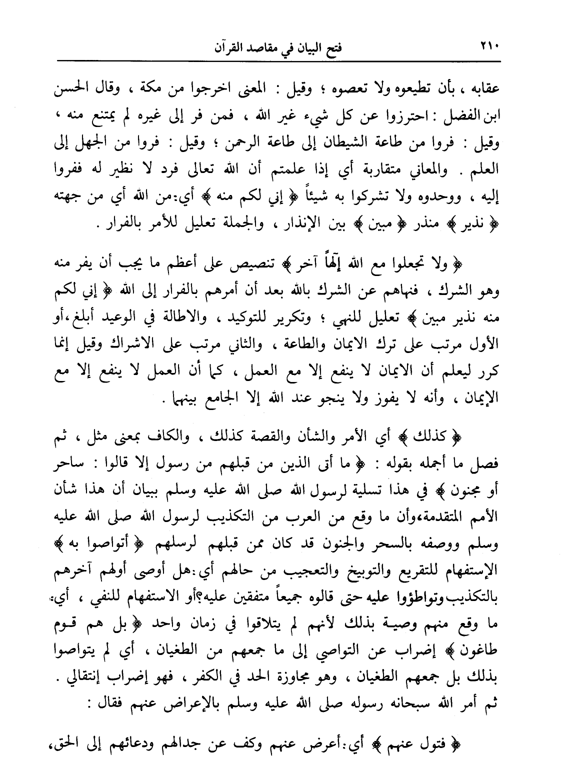 (ولا تجعلوا مع الله إلهاً آخر) تنصيص على أعظم ما يجب أن يفر منه وهو الشرك، فنهاهم عن الشرك بالله بعد أن أمرهم بالفرار إلى الله (إني لكم منه نذير مبين) تعليل للنهي؛ وتكرير للتوكيد، والإطالة في الوعيد أبلغ، أو الأول مرتب على ترك الإيمان والطاعة، والثاني مرتب على الإشراك وقيل إنما كرر ليعلم أن الإيمان لا ينفع إلا مع العمل، كما أن العمل لا ينفع إلا مع الإيمان، وأنه لا يفوز ولا ينجو عند الله إلا الجامع بينهما.