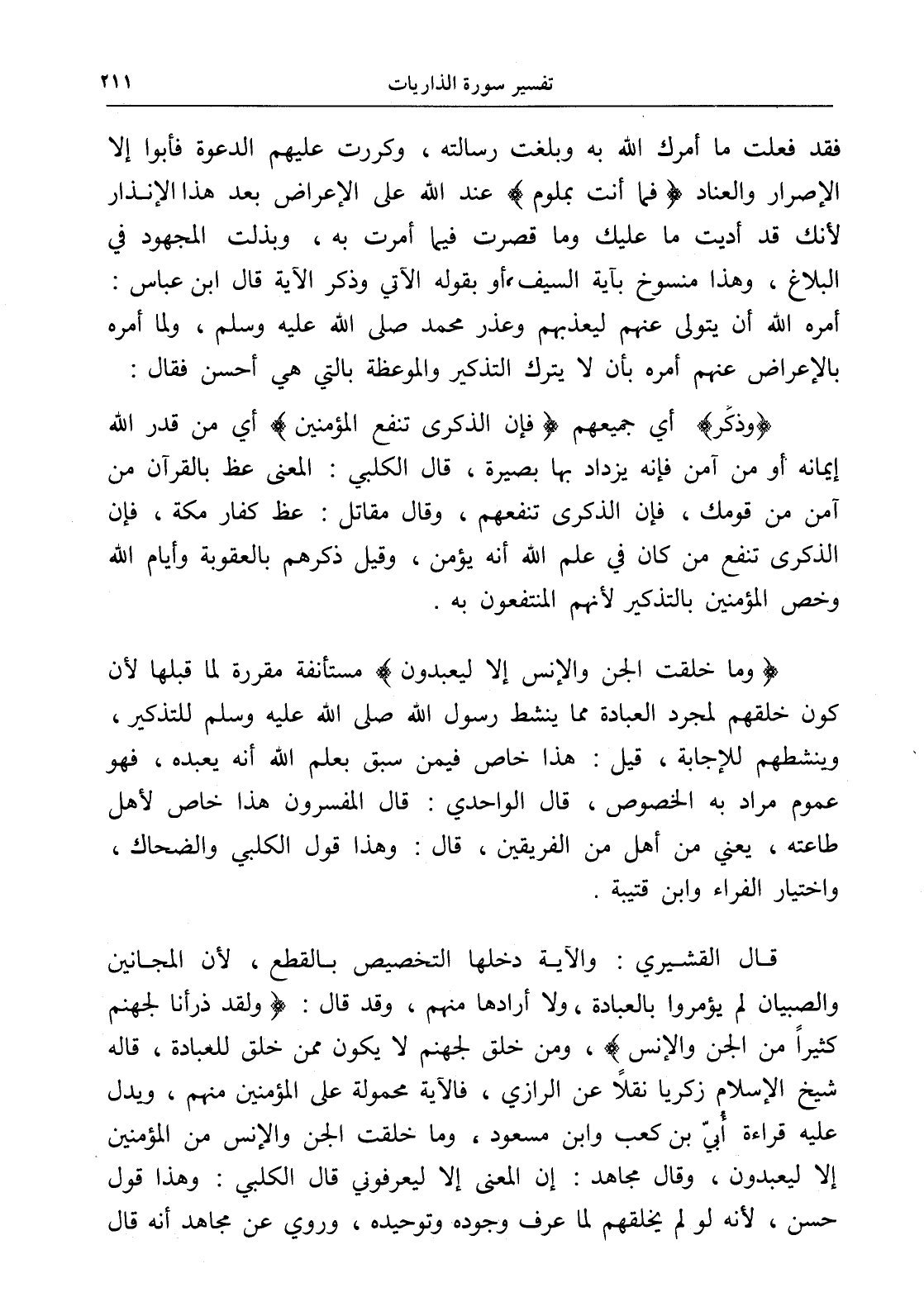 (وما خلقت الجن والإنس إلا ليعبدون) مستأنفة مقررة لما قبلها لأن كون خلقهم لمجرد العبادة مما ينشط رسول الله صلى الله عليه وسلم للتذكير، وينشطهم للإجابة، قيل: هذا خاص فيمن سبق بعلم الله أنه يعبده، فهو عموم مراد به الخصوص، قال الواحدي: قال المفسرون هذا خاص لأهل طاعته، يعني من أهل من الفريقين، قال: وهذا قول الكلبي والضحاك، واختيار الفراء وابن قتيبة.