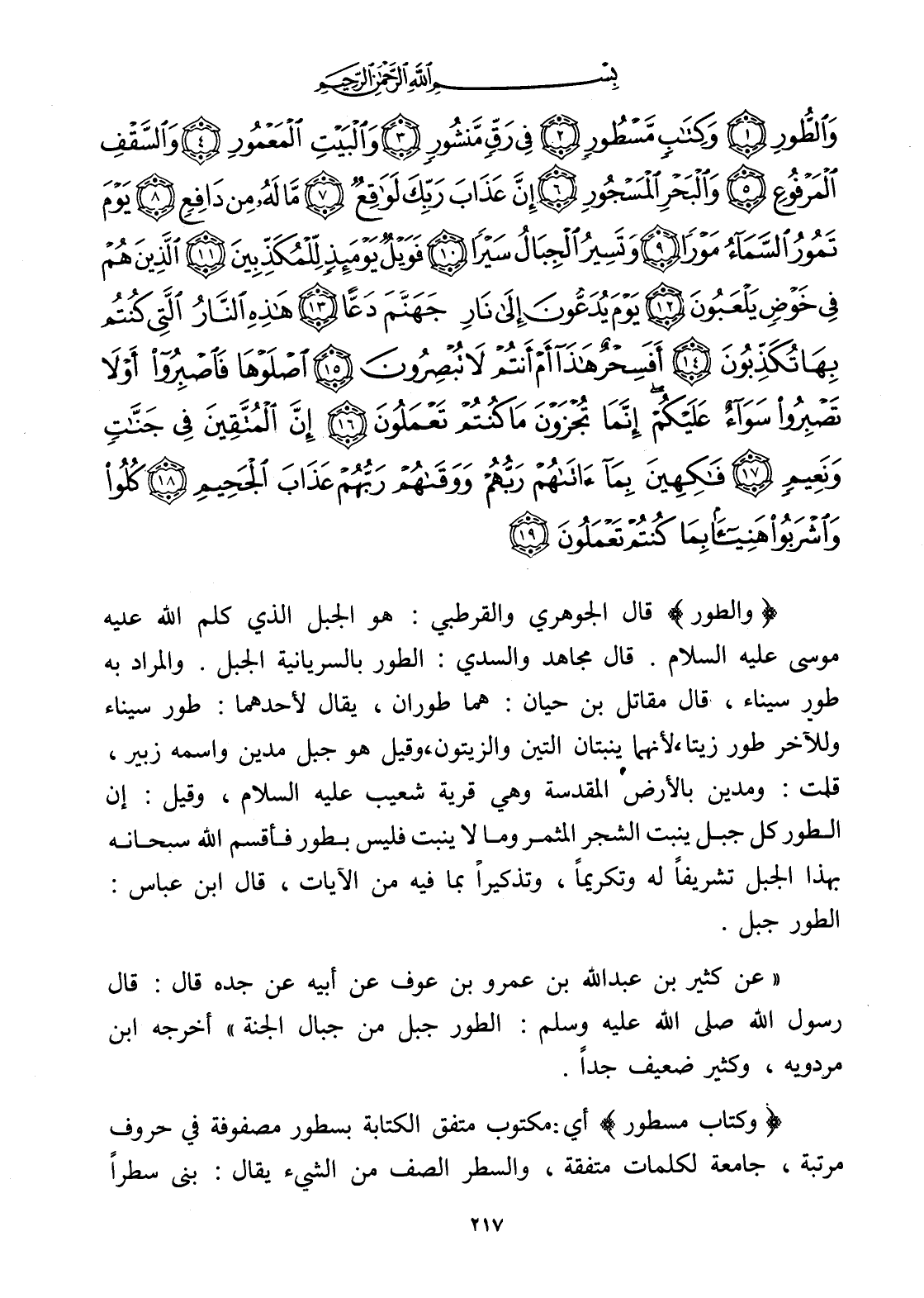 وَالطُّورِ (1) وَكِتَابٍ مَسْطُورٍ (2) فِي رَقٍّ مَنْشُورٍ (3) وَالْبَيْتِ الْمَعْمُورِ (4) وَالسَّقْفِ الْمَرْفُوعِ (5) وَالْبَحْرِ الْمَسْجُورِ (6) إِنَّ عَذَابَ رَبِّكَ لَوَاقِعٌ (7) مَا لَهُ مِنْ دَافِعٍ (8) يَوْمَ تَمُورُ السَّمَاءُ مَوْرًا (9) وَتَسِيرُ الْجِبَالُ سَيْرًا (10) فَوَيْلٌ يَوْمَئِذٍ لِلْمُكَذِّبِينَ (11) الَّذِينَ هُمْ فِي خَوْضٍ يَلْعَبُونَ (12) يَوْمَ يُدَعُّونَ إِلَى نَارِ جَهَنَّمَ دَعًّا (13) هَذِهِ النَّارُ الَّتِي كُنْتُمْ بِهَا تُكَذِّبُونَ (14) أَفَسِحْرٌ هَذَا أَمْ أَنْتُمْ لَا تُبْصِرُونَ (15) اصْلَوْهَا فَاصْبِرُوا أَوْ لَا تَصْبِرُوا سَوَاءٌ عَلَيْكُمْ إِنَّمَا تُجْزَوْنَ مَا كُنْتُمْ تَعْمَلُونَ (16) إِنَّ الْمُتَّقِينَ فِي جَنَّاتٍ وَنَعِيمٍ (17) فَاكِهِينَ بِمَا آتَاهُمْ رَبُّهُمْ وَوَقَاهُمْ رَبُّهُمْ عَذَابَ الْجَحِيمِ (18) كُلُوا وَاشْرَبُوا هَنِيئًا بِمَا كُنْتُمْ تَعْمَلُونَ (19)