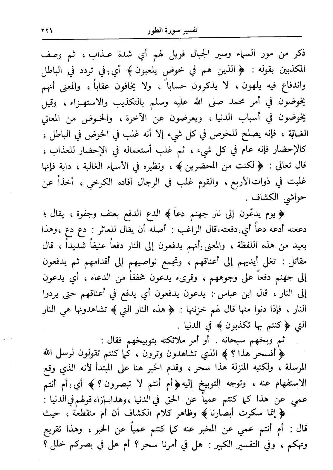 (يَوْمَ يُدَعُّونَ إِلَى نَارِ جَهَنَّمَ دَعًّا) الدع الدفع بعنف وجفوة، يقال؛ دععته أدعه دعاً أي: دفعته: قال الراغب: أصله أن يقال للعاثر: دع دع، وهذا بعيد من هذه اللفظة، والمعنى: أنهم يدفعون إلى النار دفعاً عنيفاً شديداً، قال مقاتل: تغل أيديهم إلى أعناقهم، وتجمع نواصيهم إلى أقدامهم ثم يدفعون إلى جهنم دفعاً على وجوههم، وقرىء يدعون مخففاً من الدعاء، أي يدعون إلى النار، قال ابن عباس: يدعون يدفعون أي يدفع في أعناقهم حتى يردوا النار، فإذا دنوا منها قال لهم خزننها: