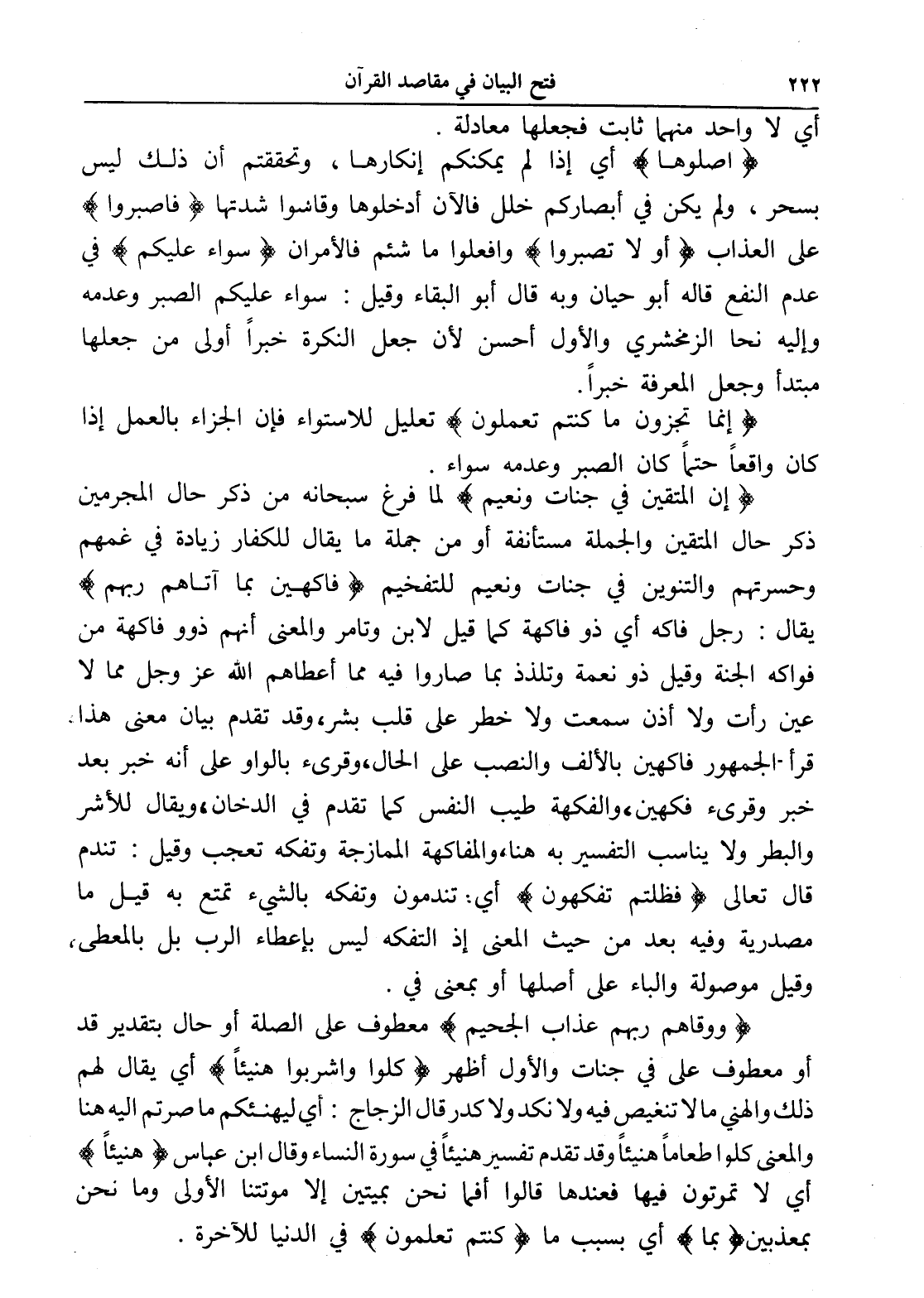 (فاكهين بما آتاهم ربهم) يقال: رجل فاكه أي ذو فاكهة كما قيل لابن وتامر والمعنى أنهم ذوو فاكهة من فواكه الجنة وقيل ذو نعمة وتلذذ بما صاروا فيه مما أعطاهم الله عز وجل مما لا عين رأت ولا أذن سمعت ولا خطر على قلب بشر، وقد تقدم بيان معنى هذا قرأ الجمهور فاكهين بالألف والنصب على الحال، وقرىء بالواو على أنه خبر بعد خبر وقرىء فكهين، والفكهة طيب النفس كما تقدم في الدخان، ويقال للأشر والبطر ولا يناسب التفسير به هنا، والمفاكهة الممازجة وتفكه تعجب وقيل: تندم قال تعالى (فَظَلْتُمْ تَفَكَّهُونَ) أي: تندمون وتفكه بالشيء تمتع به قيل ما مصدرية وفيه بعد من حيث المعنى إذ التفكه ليس بإعطاء الرب بل بالمعطى، وقيل موصولة والباء على أصلها أو بمعنى في.