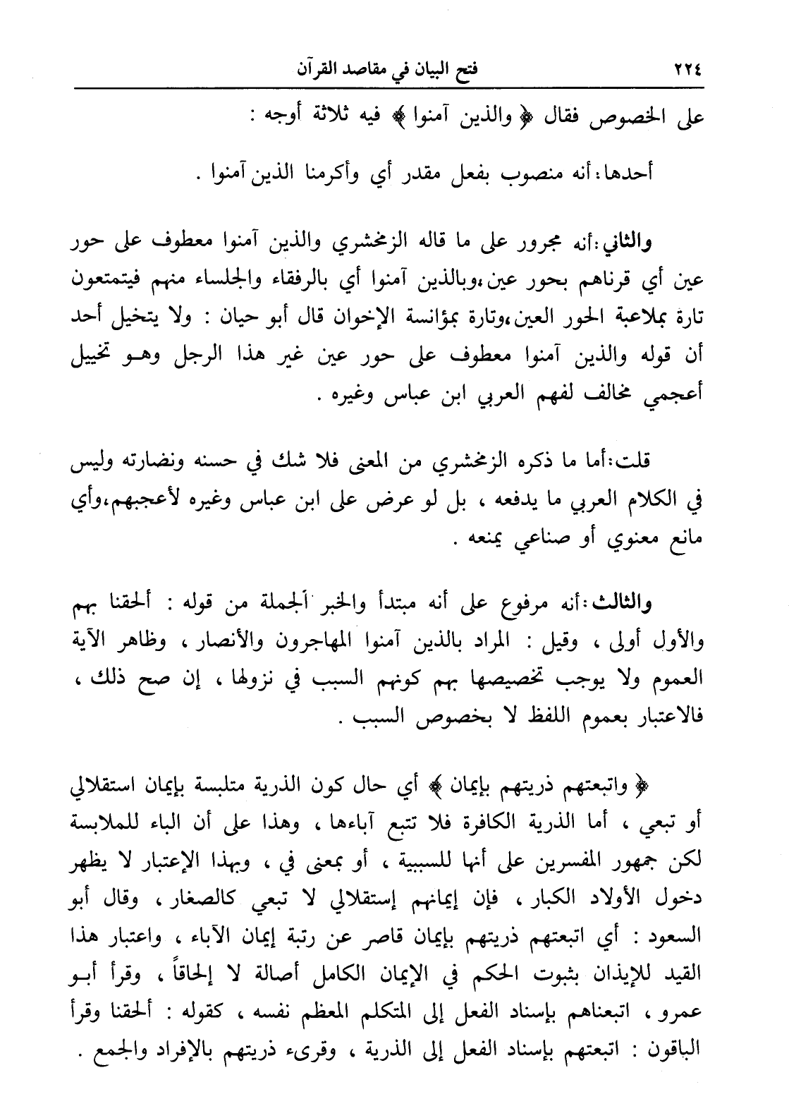 والثالث: أنه مرفوع على أنه مبتدأ والخبر الجملة من قوله: ألحقنا بهم والأول أولى، وقيل: المراد بالذين آمنوا المهاجرون والأنصار، وظاهر الآية العموم ولا يوجب تخصيصها بهم كونهم السبب في نزولها، إن صح ذلك، فالاعتبار بعموم اللفظ لا بخصوص السبب.