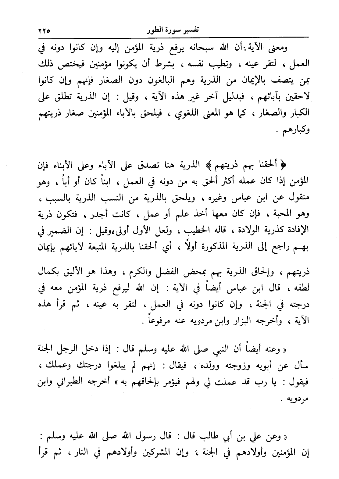 ومعنى الآية: أن الله سبحانه يرفع ذرية المؤمن إليه وإن كانوا دونه في العمل، لتقر عينه، وتطيب نفسه، بشرط أن يكونوا مؤمنين فيختص ذلك بمن يتصف بالإيمان من الذرية وهم البالغون دون الصغار فإنهم وإن كانوا لاحقين بآبائهم، فبدليل آخر غير هذه الآية، وقيل: إن الذرية تطلق على الكبار والصغار، كما هو المعنى اللغوي، فيلحق بالآباء المؤمنين صغار ذريتهم وكبارهم.