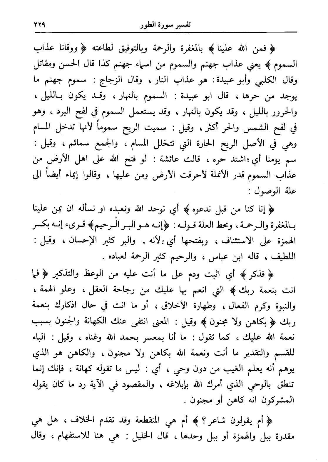 (فذكر) أي اثبت ودم على ما أنت عليه من الوعظ والتذكير (فما أنت بنعمة ربك) التي أنعم بها عليك من رجاحة العقل، وعلو الهمة، والنبوة وكرم الفعال، وطهارة الأخلاق، أو ما أنت في حال اذكارك بنعمة ربك (بكاهن ولا مجنون) وقيل: المعنى انتفى عنك الكهانة والجنون بسبب نعمة الله عليك، كما تقول: ما أنا بمعسر بحمد الله وغناه، وقيل: الباء للقسم والتقدير ما أنت ونعمة الله بكاهن ولا مجنون، والكاهن هو الذي يوهم أنه يعلم الغيب من دون وحي، أي: ليس ما تقوله كهانة، فإنك إنما تنطق بالوحي الذي أمرك الله بإبلاغه، والمقصود في الآية رد ما كان يقوله المشركون أنه كاهن أو مجنون.