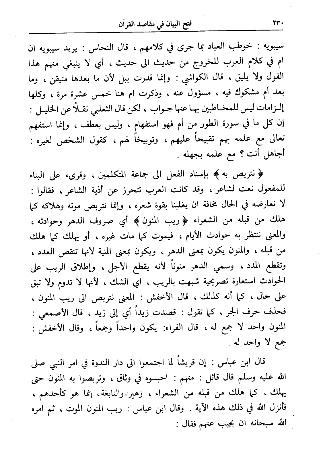 (نتربص به) بإسناد الفعل إلى جماعة المتكلمين، وقرىء على البناء للمفعول نعت لشاعر، وقد كانت العرب تتحرز عن أذية الشاعر، فقالوا: لا نعارضه في الحال مخافة أن يغلبنا بقوة شعره، وإنما نتربص موته وهلاكه كما هلك من قبله من الشعراء (ريب المنون) أي صروف الدهر وحوادثه، والمعنى ننتظر به حوادث الأيام، فيموت كما مات غيره، أو يهلك كما هلك من قبله، والمنون يكون بمعنى الدهر، ويكون بمعنى المنية لأنها تنقص العدد، وتقطع المدد، وسمي الدهر منوناً لأنه يقطع الأجل، وإطلاق الريب على الحوادث استعارة تصريحية شبهت بالريب، أي الشك، لأنها لا تدوم ولا تبق على حال، كما أنه كذلك، قال الأخفش: المعنى نتربص إلى ريب المنون، فحذف حرف الجر، كما تقول: قصدت زيداً أي إلى زيد، قال الأصمعي: المنون واحد لا جمع له، قال الفراء: يكون واحداً وجمعاً، وقال الأخفش: جمع لا واحد له.