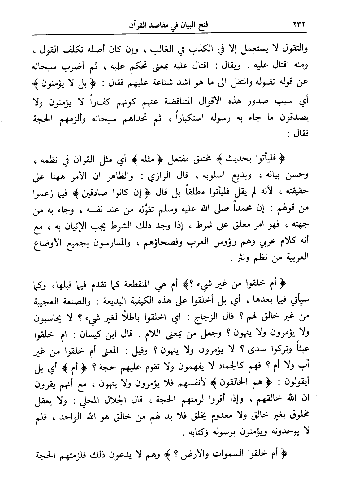 (أم خلقوا من غير شيء)؟ أم هي المنقطعة كما تقدم فيما قبلها، وكما سيأتي فيما بعدها، أي بل أخلقوا على هذه الكيفية البديعة: والصنعة العجيبة من غير خالق لهم؟ قال الزجاج: أي اخلقوا باطلاً لغير شيء؟ لا يحاسبون ولا يؤمرون ولا ينهون؟ وجعل من بمعنى اللام. قال ابن كيسان: أم خلقوا عبثاً وتركوا سدى؟ لا يؤمرون ولا ينهون؟ وقيل: المعنى أم خلقوا من غير أب ولا أم؟ فهم كالجماد لا يفهمون ولا تقوم عليهم حجة؟ (أم) أي بل أيقولون: (هم الخالقون) لأنفسهم فلا يؤمرون ولا ينهون، مع أنهم يقرون أن الله خالقهم، وإذا أقروا لزمتهم الحجة، قال الجلال المحلي: ولا يعقل مخلوق بغير خالق ولا معدوم يخلق فلا بد لهم من خالق هو الله الواحد، فلم لا يوحدونه ويؤمنون برسوله وكتابه.