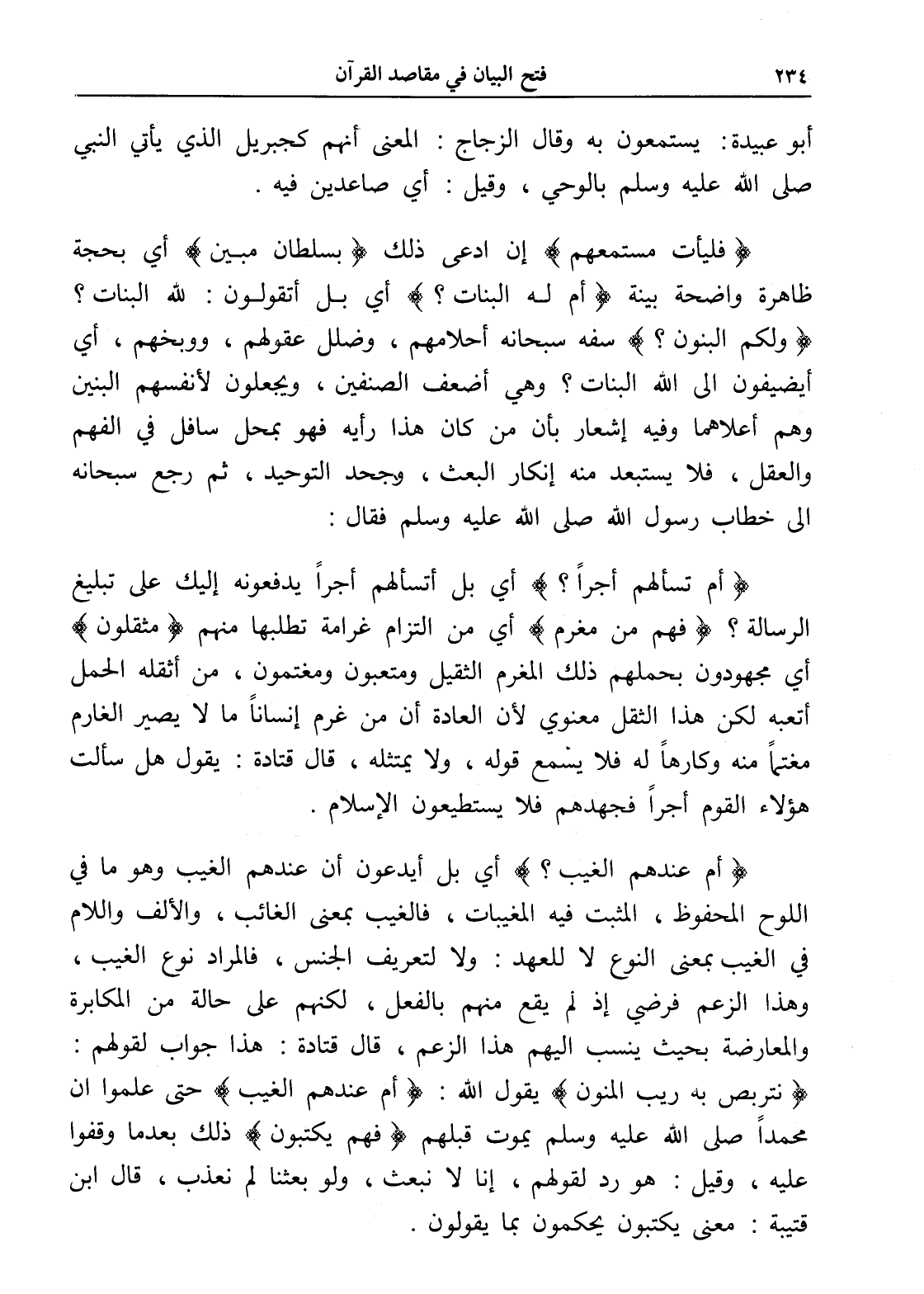 (أم تسألهم أجراً)؟ أي بل أتسألهم أجراً يدفعونه إليك على تبليغ الرسالة؟ (فهم من مغرم) أي من التزام غرامة تطلبها منهم (مثقلون) أي مجهودون بحملهم ذلك المغرم الثقيل ومتعبون ومغتمون، من أثقله الحمل أتعبه لكن هذا الثقل معنوي لأن العادة أن من غرم إنساناً ما لا يصير الغارم مغتماً منه وكارهاً له فلا يسمع قوله، ولا يمتثله، قال قتادة: يقول هل سألت هؤلاء القوم أجراً فجهدهم فلا يستطيعون الإسلام.