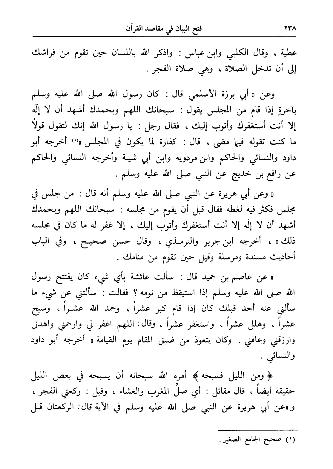 " وعن أبي هريرة عن النبي صلى الله عليه وسلم أنه قال: من جلس في مجلس فكثر فيه لغطه فقال قبل أن يقوم من مجلسه: سبحانك اللهم وبحمدك أشهد أن لا إله إلا أنت أستغفرك وأتوب إليك، إلا غفر له ما كان في مجلسه ذلك "، أخرجه ابن جرير والترمذي، وقال حسن صحيح، وفي الباب أحاديث مسندة ومرسلة وقيل حين تقوم من منامك.
