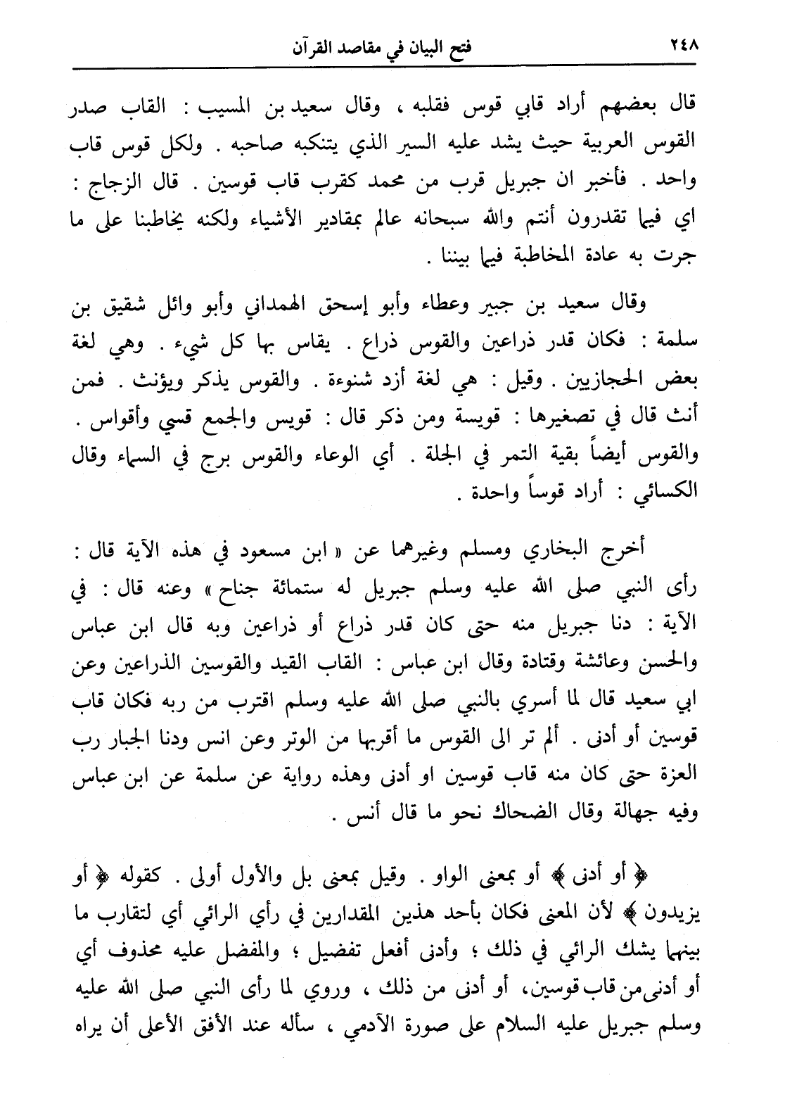 وقال سعيد بن جبير وعطاء وأبو إسحق الهمداني وأبو وائل شقيق بن سلمة: فكان قدر ذراعين والقوس ذراع. يقاس بها كل شيء. وهي لغة بعض الحجازيين. وقيل: هي لغة أزد شنوءة. والقوس يذكر ويؤنث. فمن أنث قال في تصغيرها: قويسة ومن ذكر قال: قويس والجمع قسي وأقواس. والقوس أيضاًً بقية التمر في الجلة. أي الوعاء والقوس برج في السماء وقال الكسائي: أراد قوساً واحدة.