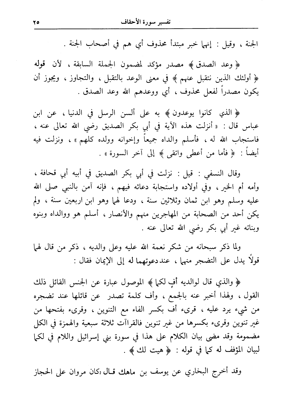 وقال النسفي: قيل: نزلت في أبي بكر الصديق في أبيه أبي قحافة، وأمه أم الخير، وفي أولاده واستجابة دعائه فيهم، فإنه آمن بالنبي صلى الله عليه وسلم وهو ابن ثمان وثلاثين سنة، ودعا لهما وهو ابن أربعين سنة، ولم يكن أحد من الصحابة من المهاجرين منهم والأنصار، أسلم هو ووالداه وبنوه وبناته غير أبي بكر رضي الله تعالى عنه.