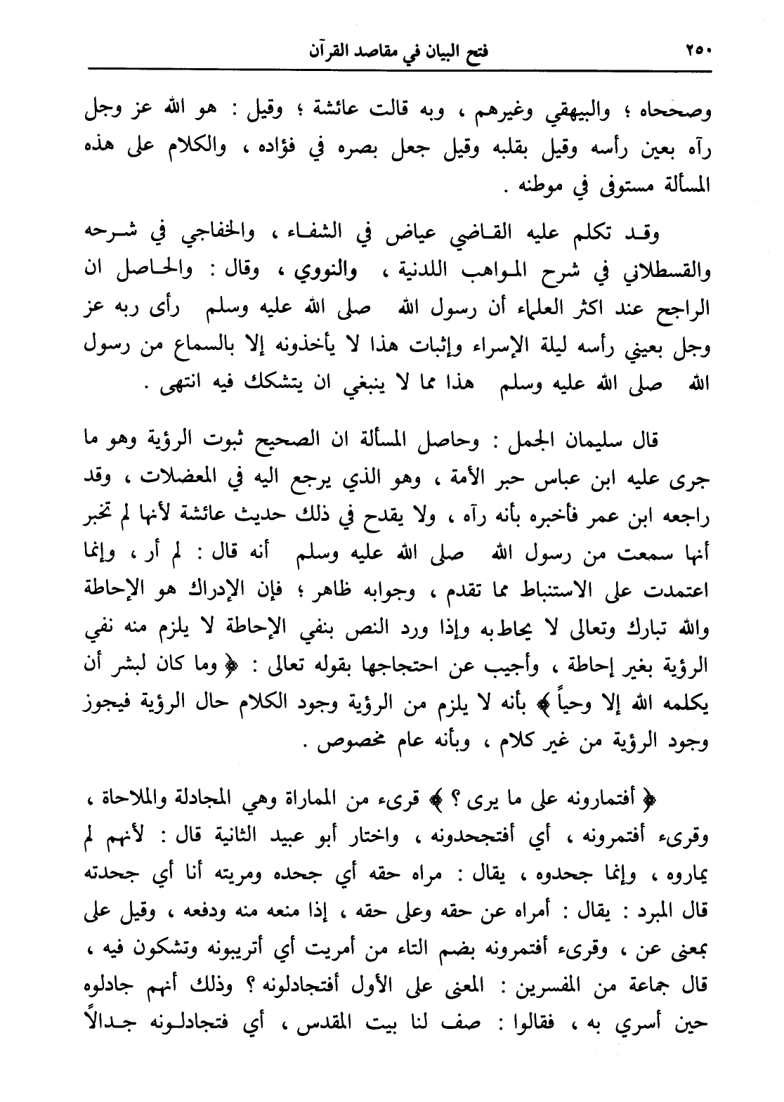 وقد تكلم عليه القاضي عياض في الشفاء، والخفاجي في شرحه والقسطلاني في شرح المواهب اللدنية، والنووي، وقال: والحاصل أن الراجح عند أكثر العلماء أن رسول الله صلى الله عليه وسلم رأى ربه عز وجل بعيني رأسه ليلة الإسراء وإثبات هذا لا يأخذونه إلا بالسماع من رسول الله صلى الله عليه وسلم هذا مما لا ينبغي أن يتشكك فيه انتهى.