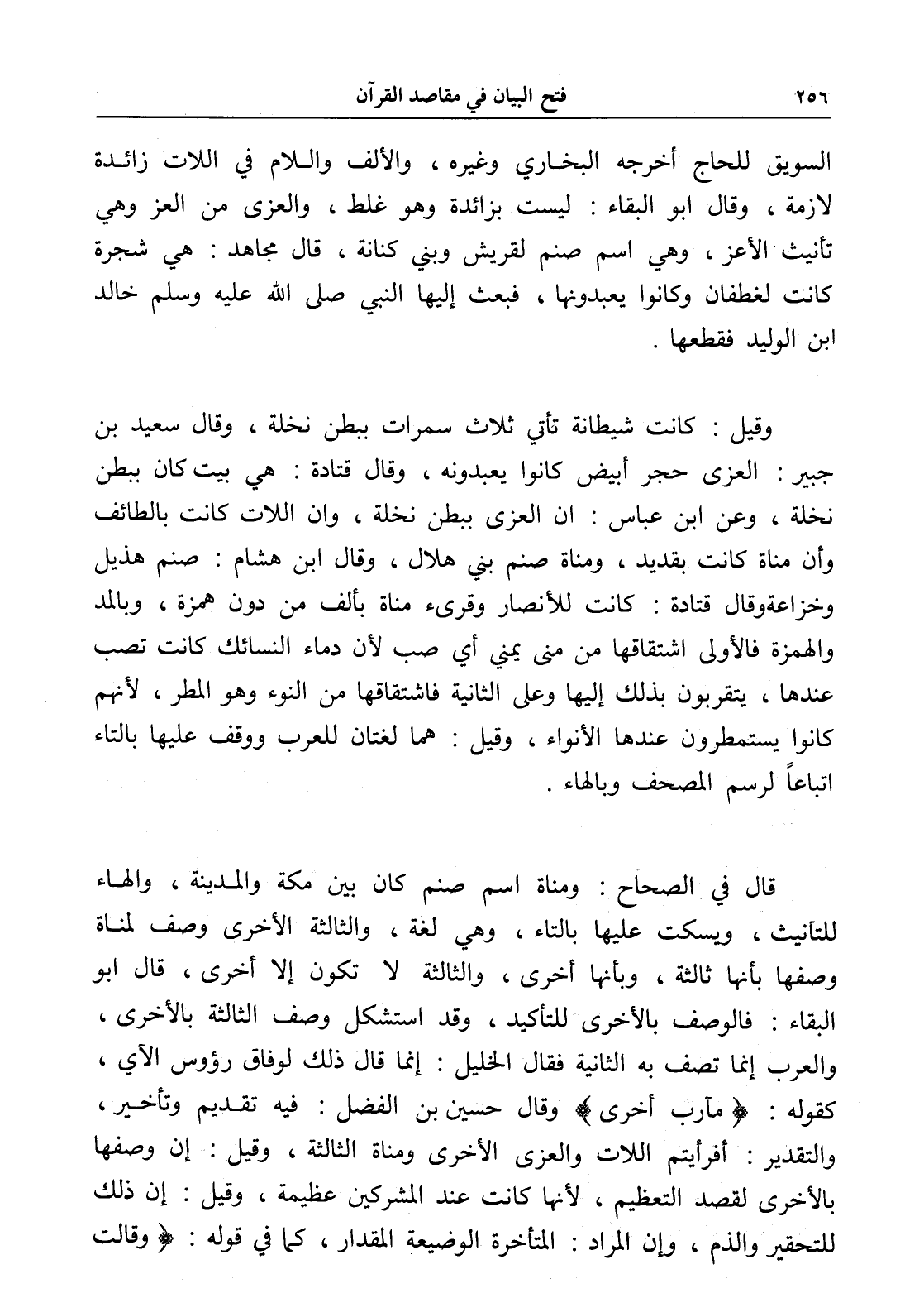 وقيل: كانت شيطانة تأتي ثلاث سمرات ببطن نخلة، وقال سعيد بن جبير: العزى حجر أبيض كانوا يعبدونه، وقال قتادة: هي بيت كان ببطن نخلة، وعن ابن عباس: أن العزى ببطن نخلة، وأن اللات كانت بالطائف وأن مناة كانت بقديد، ومناة صنم بني هلال، وقال ابن هشام: صنم هذيل وخزاعة وقال قتادة: كانت للأنصار وقرىء مناة بألف من دون همزة، وبالمد والهمزة فالأولى اشتقاقها من منى يمني أي صب لأن دماء النسائك كانت تصب عندها، يتقربون بذلك إليها وعلى الثانية فاشتقاقها من النوء وهو المطر، لأنهم كانوا يستمطرون عندها الأنواء، وقيل: هما لغتان للعرب ووقف عليها بالتاء اتباعاً لرسم المصحف وبالهاء.