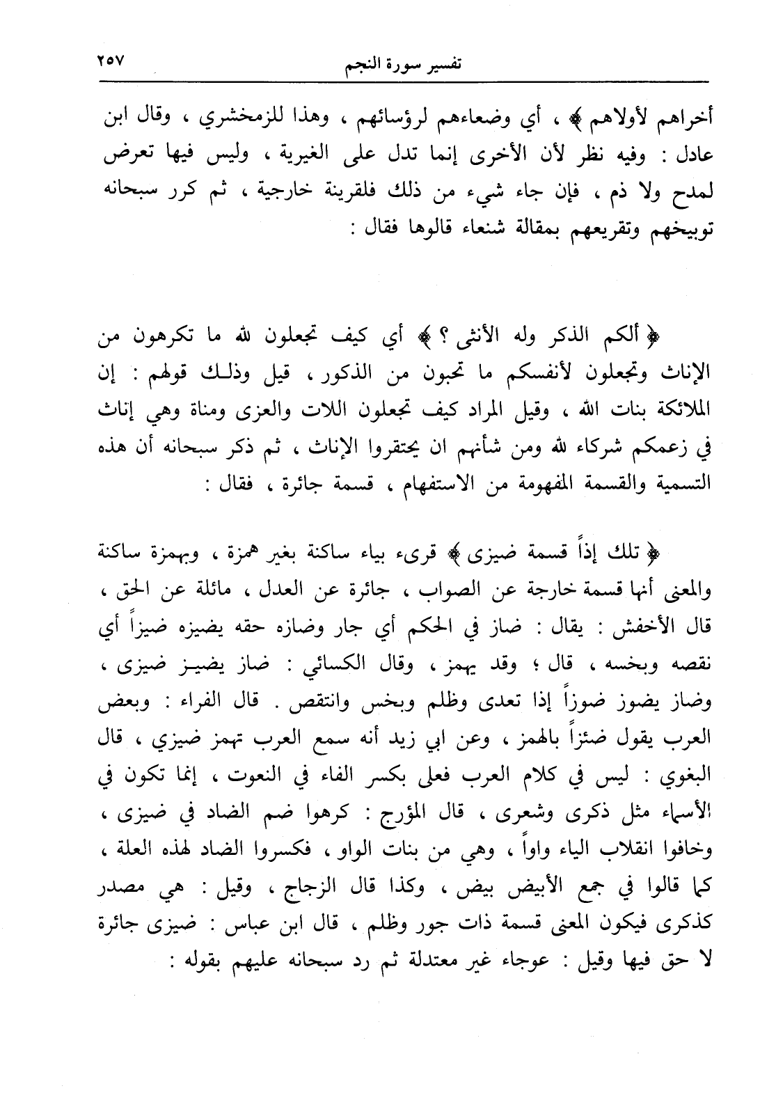 (تِلْكَ إِذًا قِسْمَةٌ ضِيزَى) قرىء بياء ساكنة بغير همزة، وبهمزة ساكنة والمعنى أنها قسمة خارجة عن الصواب، جائرة عن العدل، مائلة عن الحق، قال الأخفش: يقال: ضاز في الحكم أي جار وضازه حقه يضيزه ضيزاً أي نقصه وبخسه، قال: وقد يهمز، وقال الكسائي: ضاز يضيز ضيزى، وضاز يضوز ضوزاً إذا تعدى وظلم وبخس وانتقص. قال الفراء: وبعض العرب يقول ضئزاً بالهمز، وعن أبي زيد أنه سمع العرب تهمز ضيزي، قال البغوي: ليس في كلام العرب فعلى بكسر الفاء في النعوت، إنما تكون في الأسماء مثل ذكرى وشعرى، قال المؤرج: كرهوا ضم الضاد في ضيزى، وخافوا انقلاب الياء واواً، وهي من بنات الواو، فكسروا الضاد لهذه العلة، كما قالوا في جمع الأبيض بيض، وكذا قال الزجاج، وقيل: هي مصدر كذكرى فيكون المعنى قسمة ذات جور وظلم، قال ابن عباس: ضيزى جائرة لا حق فيها وقيل: عوجاء غير معتدلة ثم رد سبحانه عليهم بقوله: