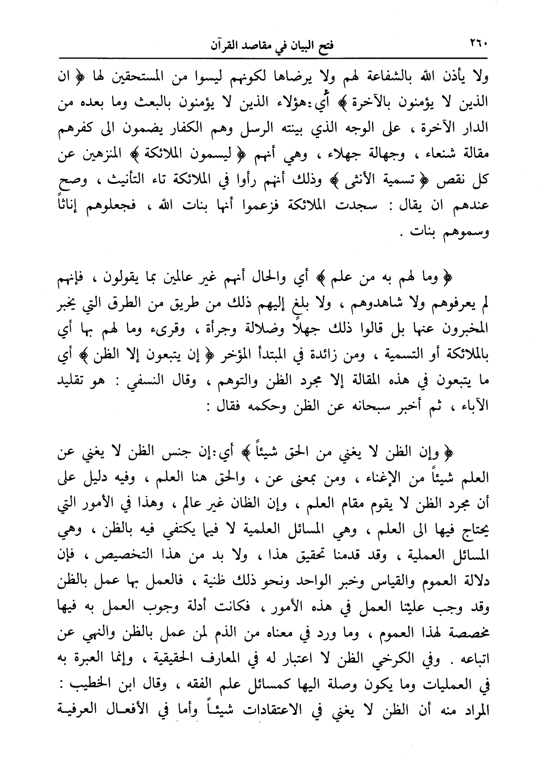 (وإن الظن لا يغني من الحق شيئاًً) أي: إن جنس الظن لا يغني عن العلم شيئاًً من الإغناء، ومن بمعنى عن، والحق هنا العلم، وفيه دليل على أن مجرد الظن لا يقوم مقام العلم، وإن الظان غير عالم، وهذا في الأمور التي يحتاج فيها إلى العلم، وهي المسائل العلمية لا فيما يكتفي فيه بالظن، وهي المسائل العملية، وقد قدمنا تحقيق هذا، ولا بد من هذا التخصيص، فإن دلالة العموم والقياس وخبر الواحد ونحو ذلك ظنية، فالعمل بها عمل بالظن وقد وجب علينا العمل في هذه الأمور، فكانت أدلة وجوب العمل به فيها مخصصة لهذا العموم، وما ورد في معناه من الذم لمن عمل بالظن والنهي عن اتباعه. وفي الكرخي الظن لا اعتبار له في العارف الحقيقية، وإنما العبرة به في العمليات وما يكون وصلة إليها كمسائل علم الفقه، وقال ابن الخطيب: المراد منه أن الظن لا يغني في الاعتقادات شيئاًً وأما في الأفعال العرفية