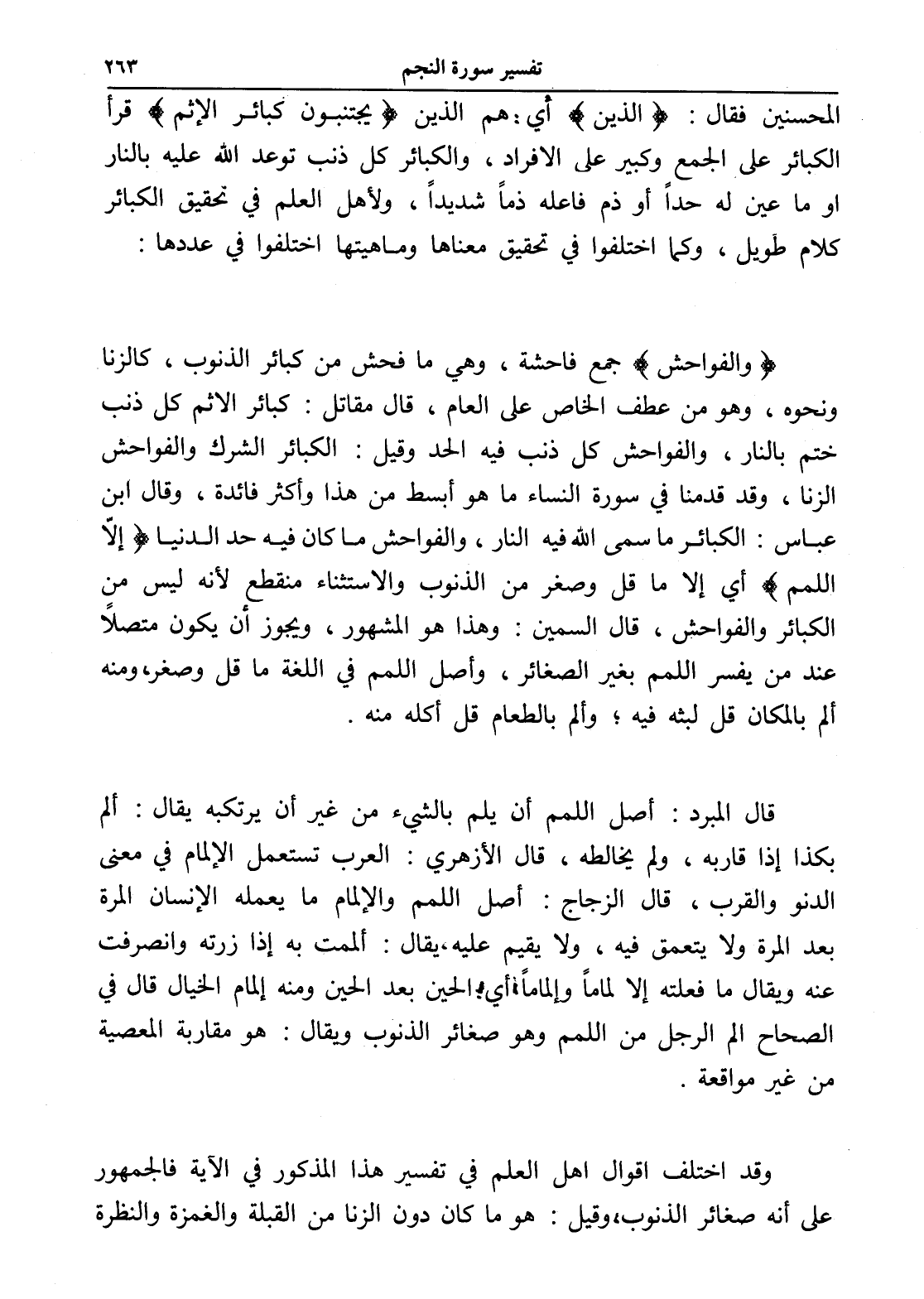 (الذين) أي: هم الذين (يجتنبون كبائر الإثم) قرأ الكبائر على الجمع وكبير على الإفراد، والكبائر كل ذنب توعد الله عليه بالنار أو ما عين له حداً أو ذم فاعله ذماً شديداً، ولأهل العلم في تحقيق الكبائر كلام طويل، وكما اختلفوا في تحقيق معناها وماهيتها اختلفوا في عددها: