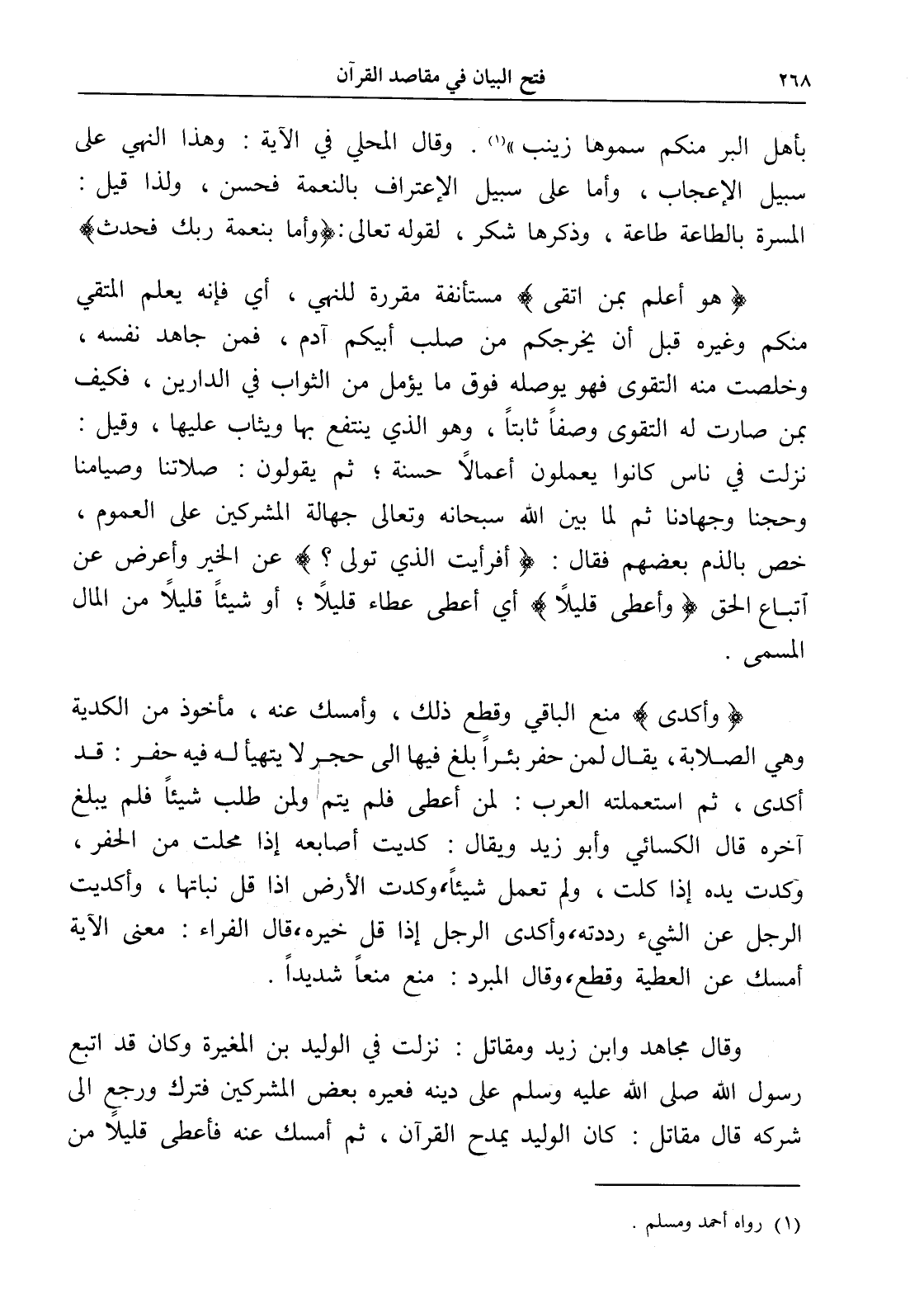 وقال مجاهد وابن زيد ومقاتل: نزلت في الوليد بن المغيرة وكان قد اتبع رسول الله صلى الله عليه وسلم على دينه فعيره بعض المشركين فترك ورجع إلى شركه قال مقاتل: كان الوليد يمدح القرآن، ثم أمسك عنه فأعطى قليلاً من
