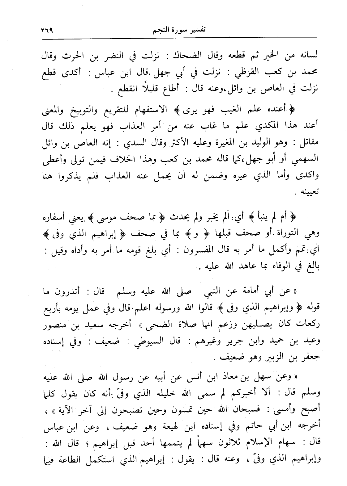 (وإبراهيم الذي وفى) قالوا الله ورسوله أعلم قال وفى عمل يومه بأربع ركعات كان يصليهن وزعم أنها صلاة الضحى " أخرجه سعيد بن منصور وعبد بن حميد وابن جرير وغيرهم: قال السيوطي: ضعيف: وفي إسناده جعفر بن الزبير وهو ضعيف.