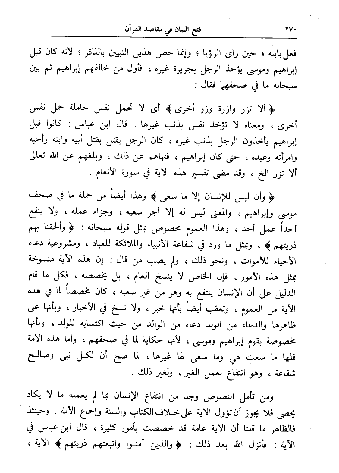 ومن تأمل النصوص وجد من انتفاع الإنسان بما لم يعمله ما لا يكاد يحصى فلا يجوز أن تؤول الآية على خلاف الكتاب والسنة وإجماع الأمة. وحينئذ فالظاهر ما قلنا أن الآية عامة قد خصصت بأمور كثيرة، قال ابن عباس في الآية: فأنزل الله بعد ذلك: (والذين آمنوا واتبعتهم ذريتهم) الآية،