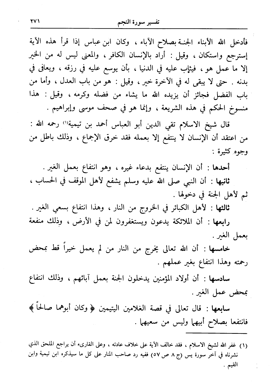 (¬1) غفر الله لشيخ الإسلام، فقد خالف الآية على خلاف عادته، وعلى القارىء أن يراجع الملحق الذي نشرناه في آخر سورة يس (ج 8 ص 57) ففيه رد صاحب المنار على كل ما سيذكره ابن تيمية وابن القيم.