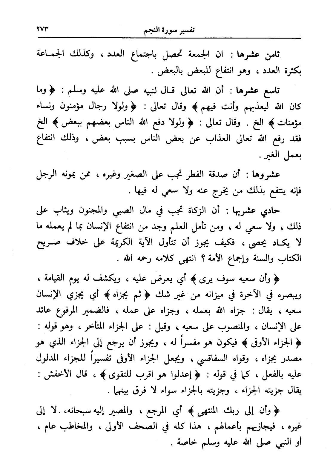حادي عشريها: أن الزكاة تجب في مال الصبي والمجنون ويثاب على ذلك، ولا سعي له، ومن تأمل العلم وجد من انتفاع الإنسان بما لم يعمله ما لا يكاد يحصى، فكيف يجوز أن تتأول الآية الكريمة على خلاف صريح الكتاب والسنة وإجماع الأمة؟ انتهى كلامه رحمه الله.