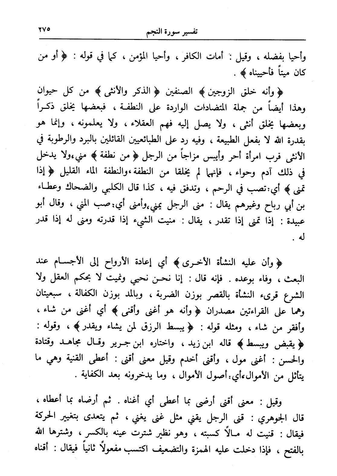 (وَأَنَّهُ هُوَ أَغْنَى وَأَقْنَى) أي أغنى من شاء، وأفقر من شاء، ومثله قوله: (يبسط الرزق لمن يشاء ويقدر)، وقوله: (يقبض ويبسط) قاله ابن زيد، واختاره ابن جرير وقال مجاهد وقتادة والحسن: أغنى مول، وأقنى أخدم وقيل معنى أقنى: أعطى القنية وهي ما يتأثل من الأموال، أي. أصول الأموال، وما يدخرونه بعد الكفاية.