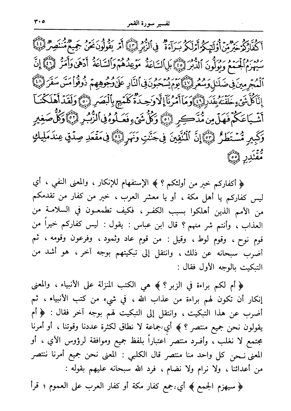 أَكُفَّارُكُمْ خَيْرٌ مِنْ أُولَئِكُمْ أَمْ لَكُمْ بَرَاءَةٌ فِي الزُّبُرِ (43) أَمْ يَقُولُونَ نَحْنُ جَمِيعٌ مُنْتَصِرٌ (44) سَيُهْزَمُ الْجَمْعُ وَيُوَلُّونَ الدُّبُرَ (45) بَلِ السَّاعَةُ مَوْعِدُهُمْ وَالسَّاعَةُ أَدْهَى وَأَمَرُّ (46) إِنَّ الْمُجْرِمِينَ فِي ضَلَالٍ وَسُعُرٍ (47) يَوْمَ يُسْحَبُونَ فِي النَّارِ عَلَى وُجُوهِهِمْ ذُوقُوا مَسَّ سَقَرَ (48) إِنَّا كُلَّ شَيْءٍ خَلَقْنَاهُ بِقَدَرٍ (49) وَمَا أَمْرُنَا إِلَّا وَاحِدَةٌ كَلَمْحٍ بِالْبَصَرِ (50) وَلَقَدْ أَهْلَكْنَا أَشْيَاعَكُمْ فَهَلْ مِنْ مُدَّكِرٍ (51) وَكُلُّ شَيْءٍ فَعَلُوهُ فِي الزُّبُرِ (52) وَكُلُّ صَغِيرٍ وَكَبِيرٍ مُسْتَطَرٌ (53) إِنَّ الْمُتَّقِينَ فِي جَنَّاتٍ وَنَهَرٍ (54) فِي مَقْعَدِ صِدْقٍ عِنْدَ مَلِيكٍ مُقْتَدِرٍ (55)