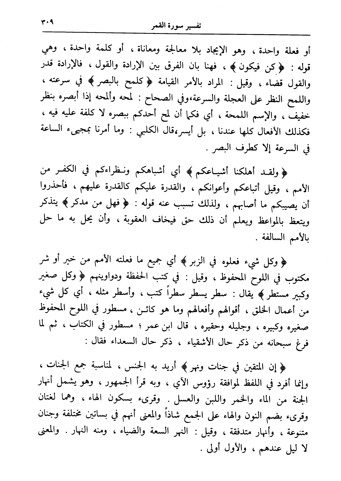 أو فعلة واحدة، وهو الإيجاد بلا معالجة ومعاناة، أو كلمة واحدة، وهي قوله: (كن فيكون)، فهنا بان الفرق بين الإرادة والقول، فالإرادة قدر والقول قضاء، وقيل: المراد بالأمر القيامة (كلمح بالبصر) في سرعته، واللمح النظر على العجلة والسرعة، وفي الصحاح: لمحه وألمحه إذا أبصره بنظر خفيف، والإسم اللمحة، أي فكما أن لمح أحدكم ببصره لا كلفة عليه فيه، فكذلك الأفعال كلها عندنا، بل أيسر، قال الكلبي: وما أمرنا بمجيىء الساعة في السرعة إلا كطرف البصر.