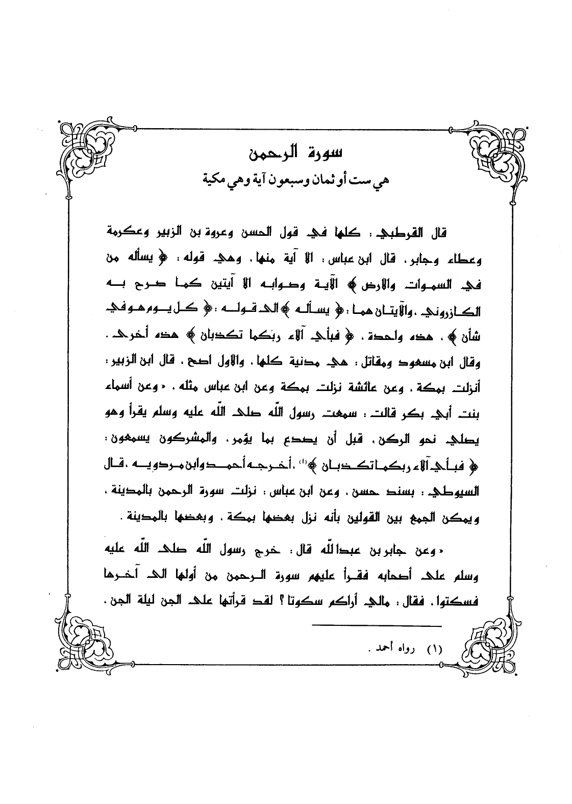 " وعن جابر بن عبد الله قال: خرج رسول الله - صلى الله عليه وسلم - على أصحابه فقرأ عليهم سورة الرحمن من أولها إلى آخرها فسكتوا، فقال: مالي أراكم سكوتاً؟ لقد قرأتها على الجن ليلة الجن،
