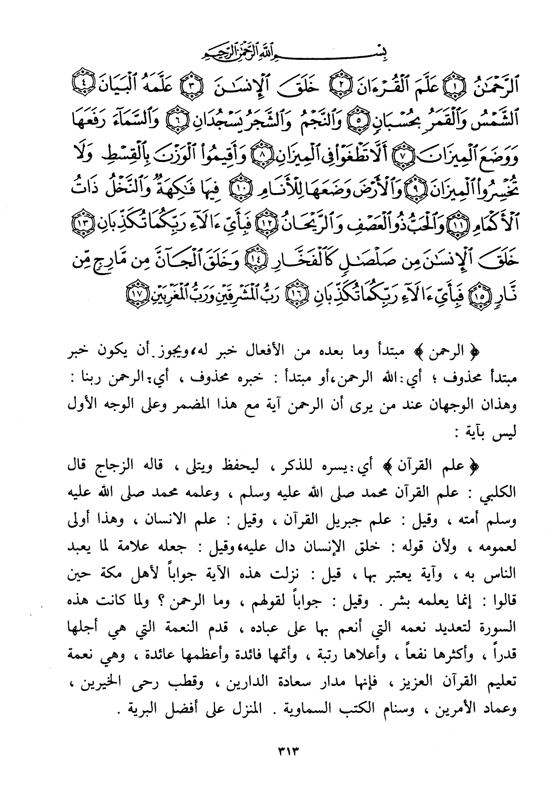 الرَّحْمَنُ (1) عَلَّمَ الْقُرْآنَ (2) خَلَقَ الْإِنْسَانَ (3) عَلَّمَهُ الْبَيَانَ (4) الشَّمْسُ وَالْقَمَرُ بِحُسْبَانٍ (5) وَالنَّجْمُ وَالشَّجَرُ يَسْجُدَانِ (6) وَالسَّمَاءَ رَفَعَهَا وَوَضَعَ الْمِيزَانَ (7) أَلَّا تَطْغَوْا فِي الْمِيزَانِ (8) وَأَقِيمُوا الْوَزْنَ بِالْقِسْطِ وَلَا تُخْسِرُوا الْمِيزَانَ (9) وَالْأَرْضَ وَضَعَهَا لِلْأَنَامِ (10) فِيهَا فَاكِهَةٌ وَالنَّخْلُ ذَاتُ الْأَكْمَامِ (11) وَالْحَبُّ ذُو الْعَصْفِ وَالرَّيْحَانُ (12) فَبِأَيِّ آلَاءِ رَبِّكُمَا تُكَذِّبَانِ (13) خَلَقَ الْإِنْسَانَ مِنْ صَلْصَالٍ كَالْفَخَّارِ (14) وَخَلَقَ الْجَانَّ مِنْ مَارِجٍ مِنْ نَارٍ (15) فَبِأَيِّ آلَاءِ رَبِّكُمَا تُكَذِّبَانِ (16) رَبُّ الْمَشْرِقَيْنِ وَرَبُّ الْمَغْرِبَيْنِ (17)